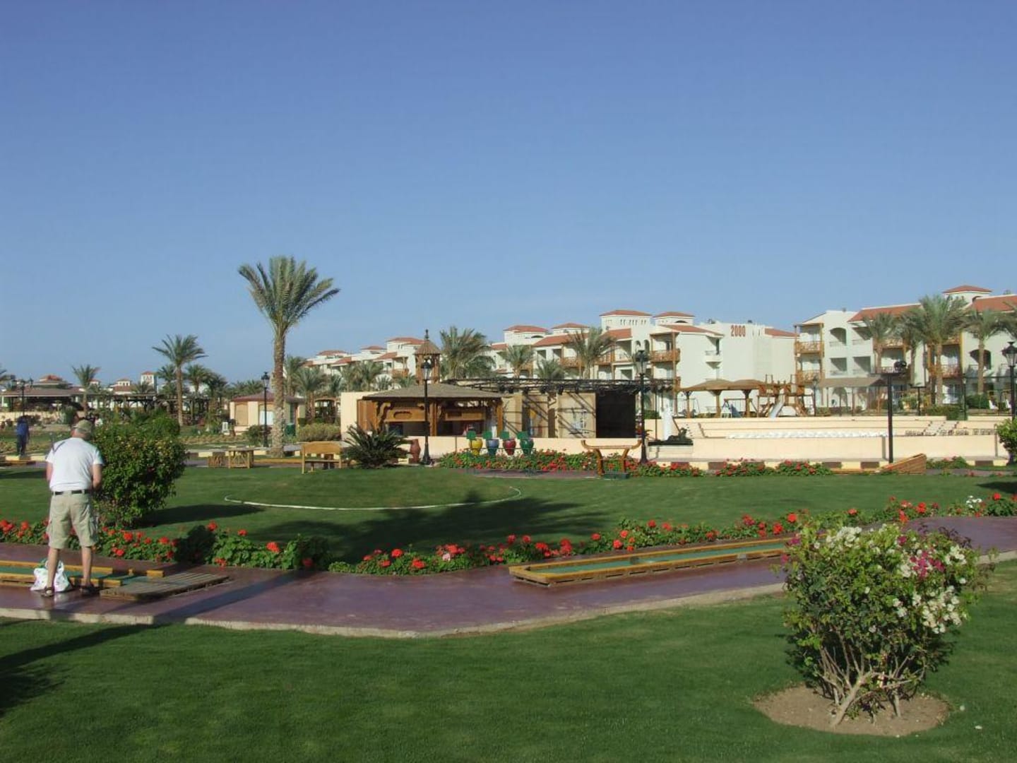 Im Hintergrund ist das eigene Amphitheater zu sehen. vorne eine Bahn der Minigolfanlage. Ganz hinten die 1000er und 2000er Blöcke.