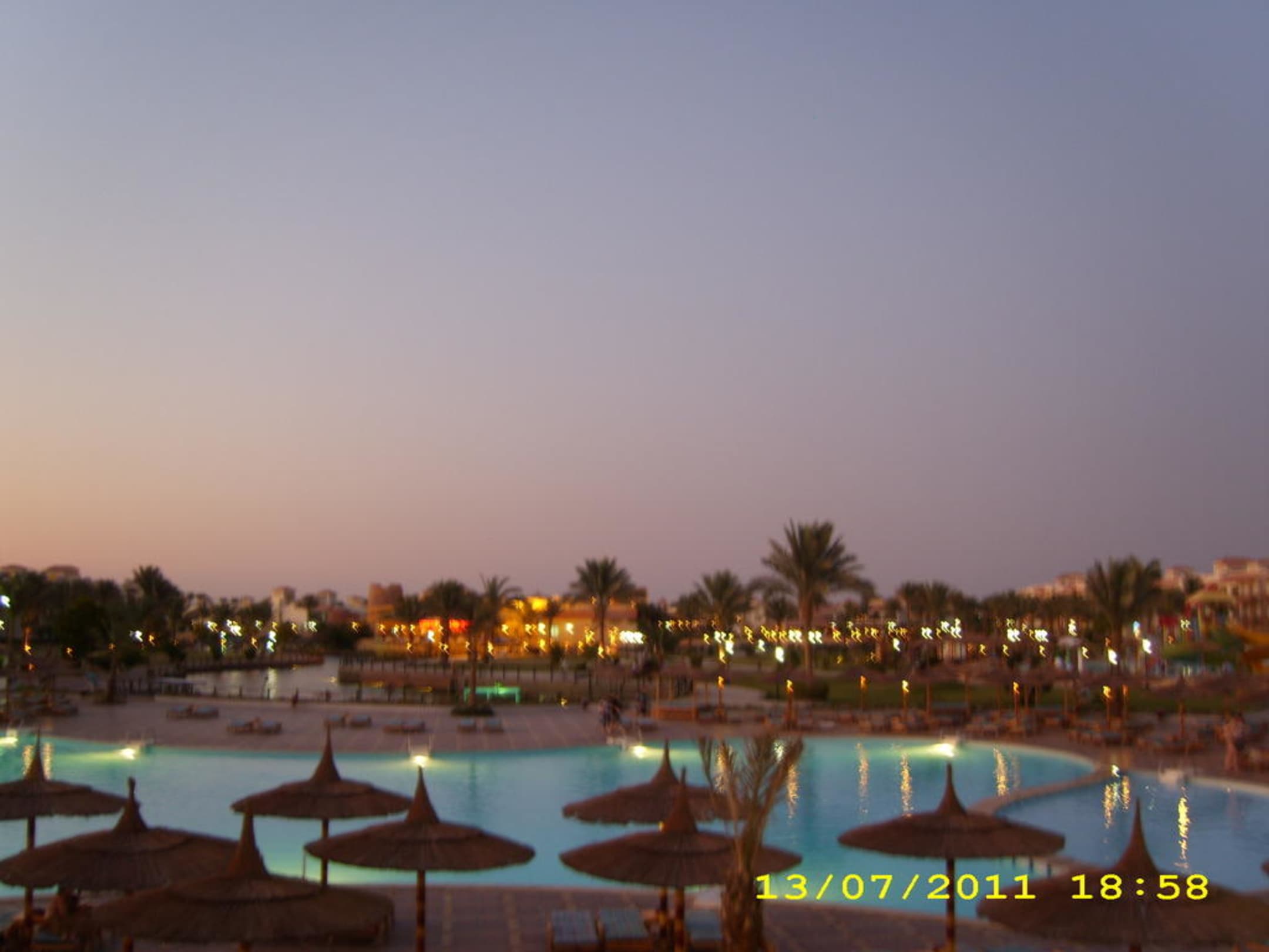 Große Poolanlage bei Nacht.
