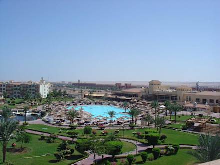 Gartenanlage mit Pool. Links die 1000-er, rechts das Hauptgebäude mit Rezeption und den Restaurants " le Chief de l Orient" und "Don Camillo" sowie verschiedenen Bars.