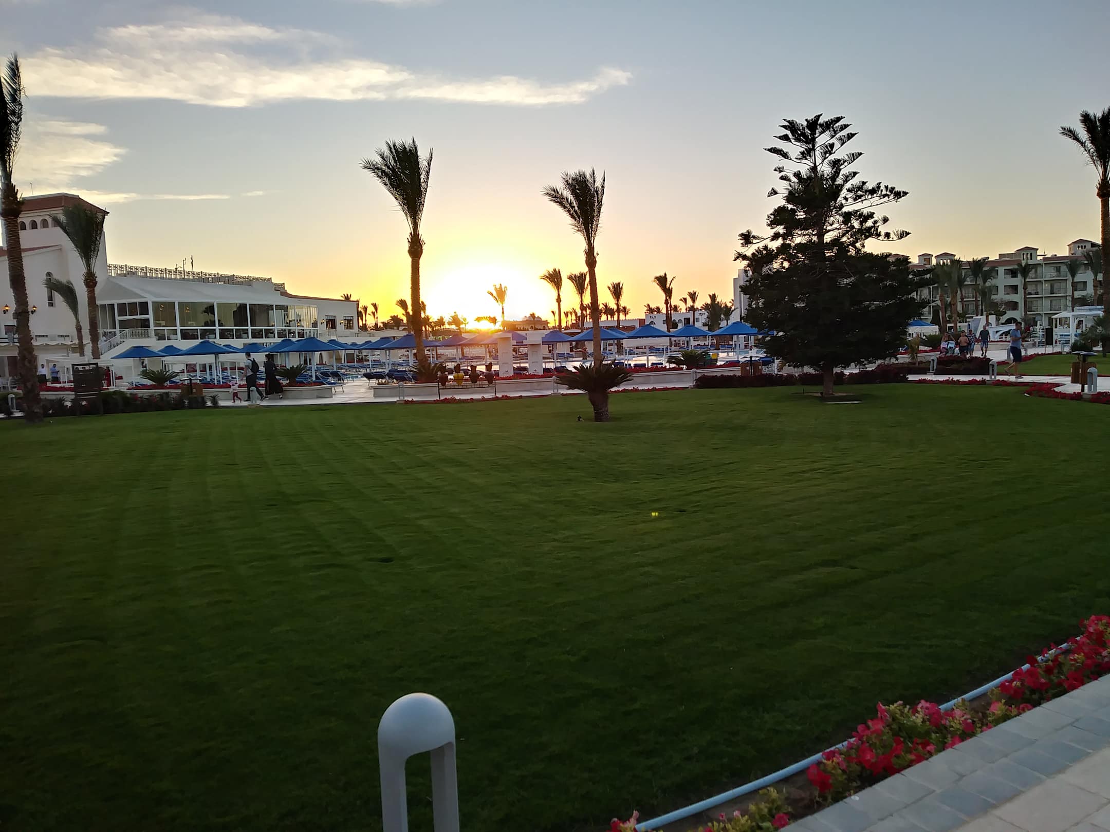Blick vom Restaurant Kaiser zum Pool beim Sonnenuntergang