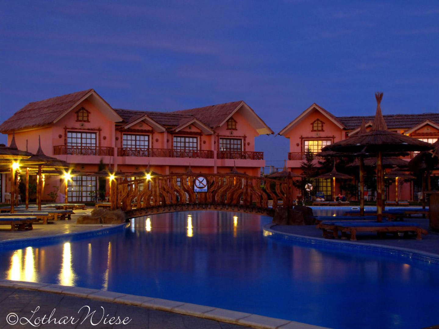 Bungalows am Pool bei Anbruch der Nacht