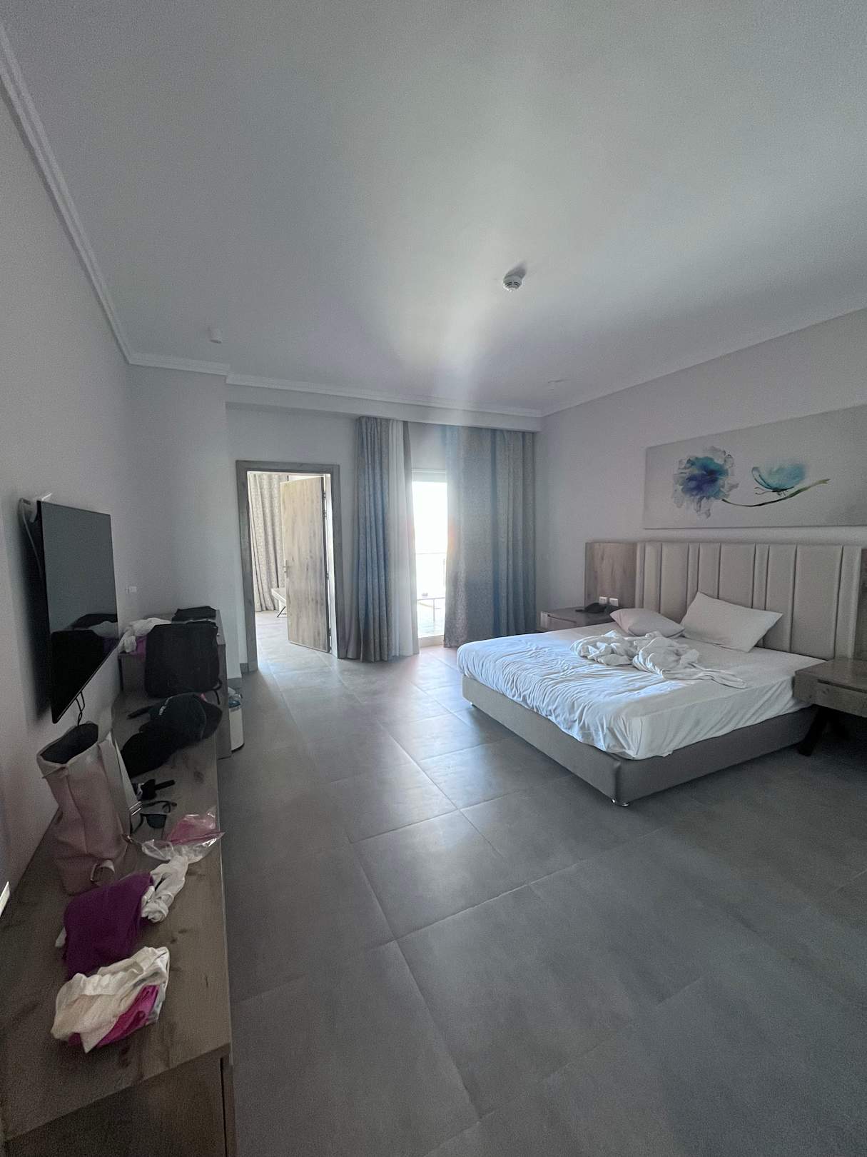 ZimmerSuite - Schlafzimmer mit Flat Tv, riesigen Box Springbett und eigenem Zugang zum Balkon sowie und Wohnzimmer