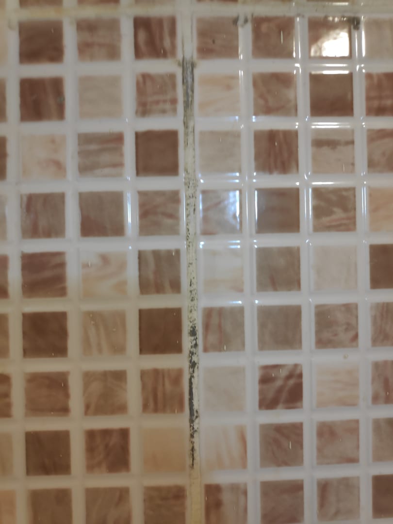 Renovierungsbedürftiges Zimmer. An den Fugen Dreck/Schimmel