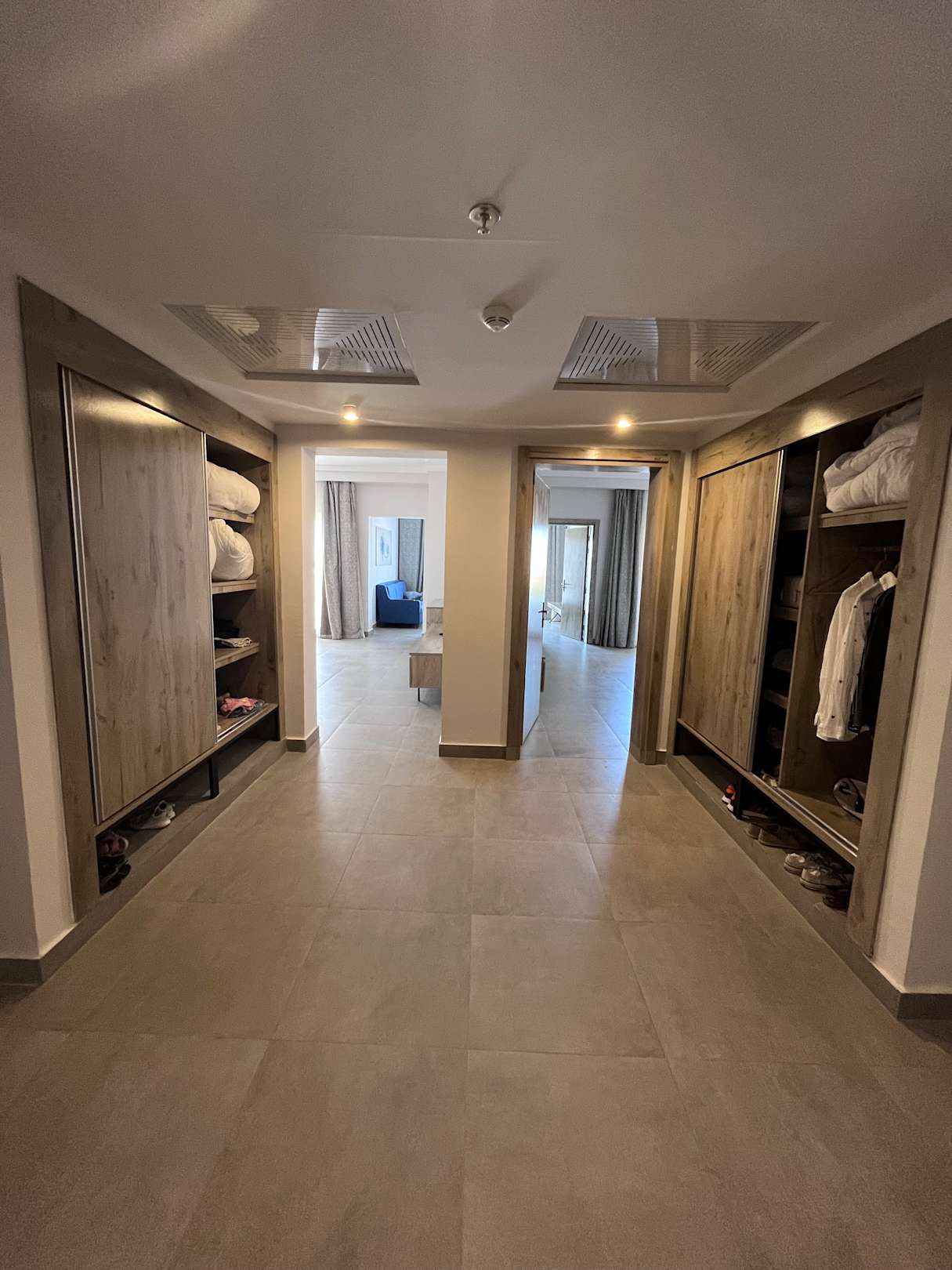 Blick von der Eingangstür Richtung Balkon - links das links und rechts die Bäder, gefolgt von den Schränken für Kleidung anschließend geht es links ins Kinderzimmer rechts ins Schlafzimmer und dahinter Wohnzimmer und Balkon