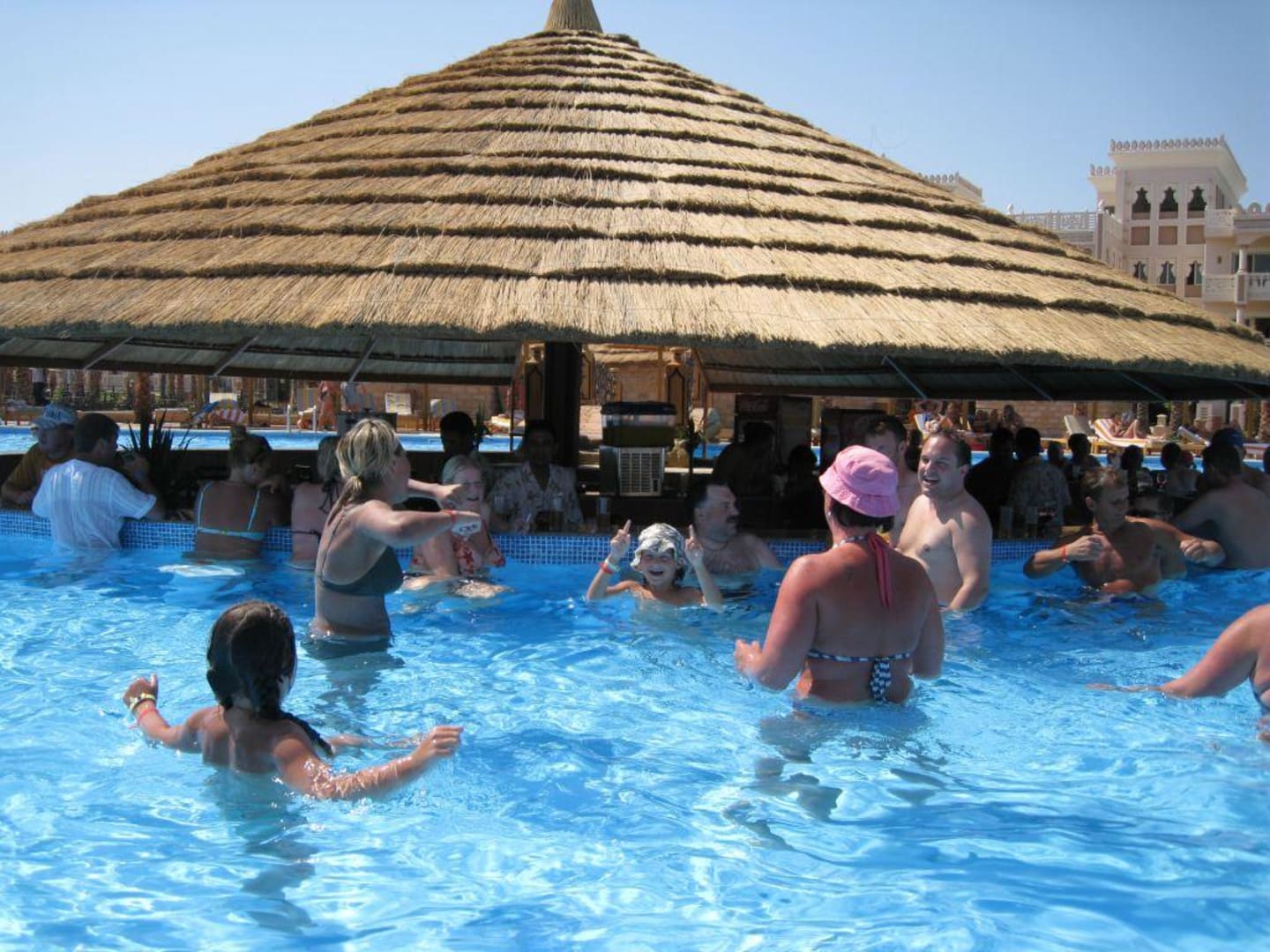 Hier sieht man die Swim up-Bar. Zur einen Hälfte wird die vom Pool aus benutzt, von der anderen Hälfte als normale Bar. Nachmittags sitzt man im Pool im Schatten beim Trinken...