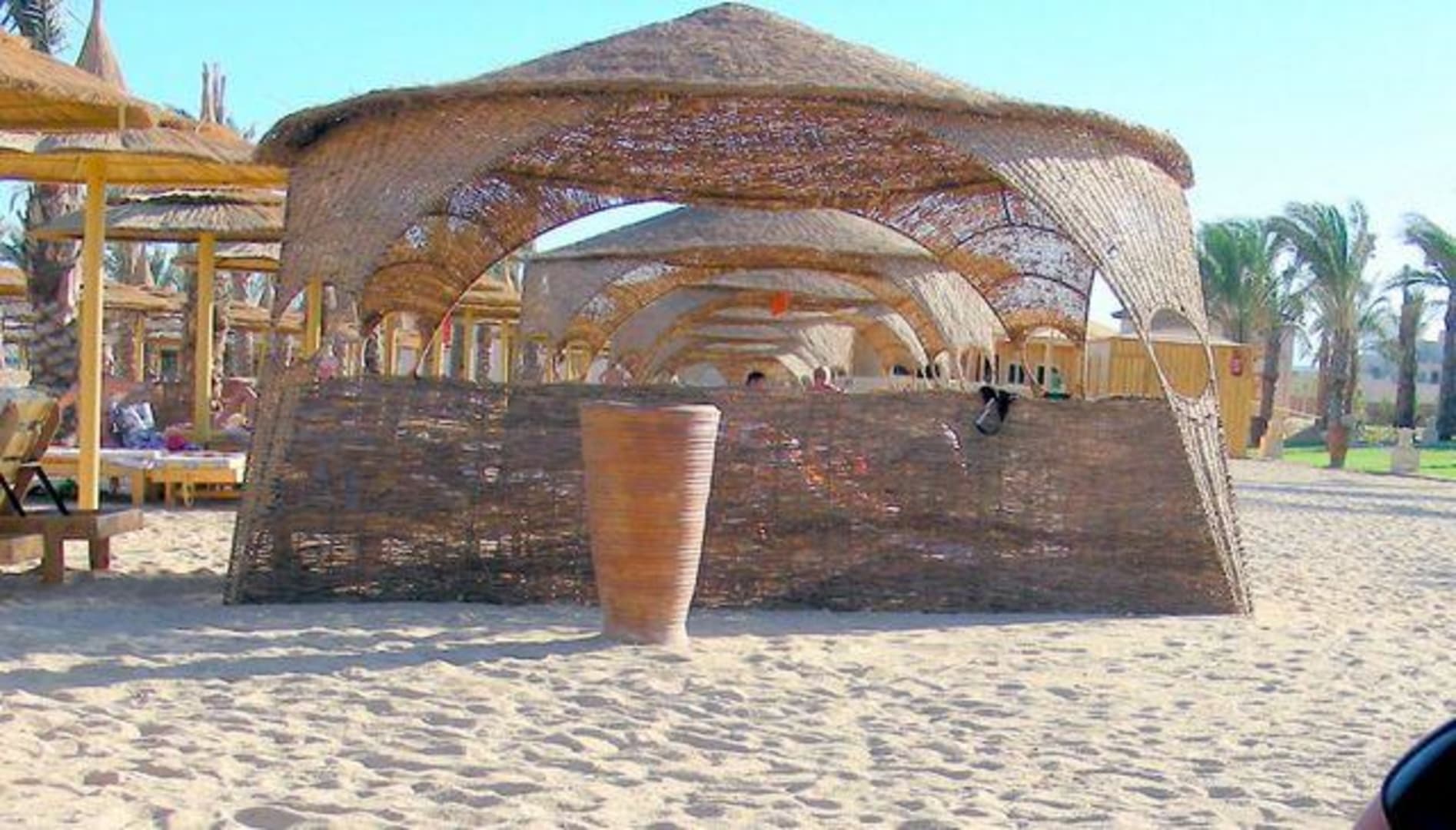 Heiß begehrt diese wenigen Pavillon und nach 8:00 Uhr nicht mehr zu haben. Vorteil: Viel Platz zum nachbarn Nachteil: Sonne kommt gut durch und kann unbemerkt gefährlich werden