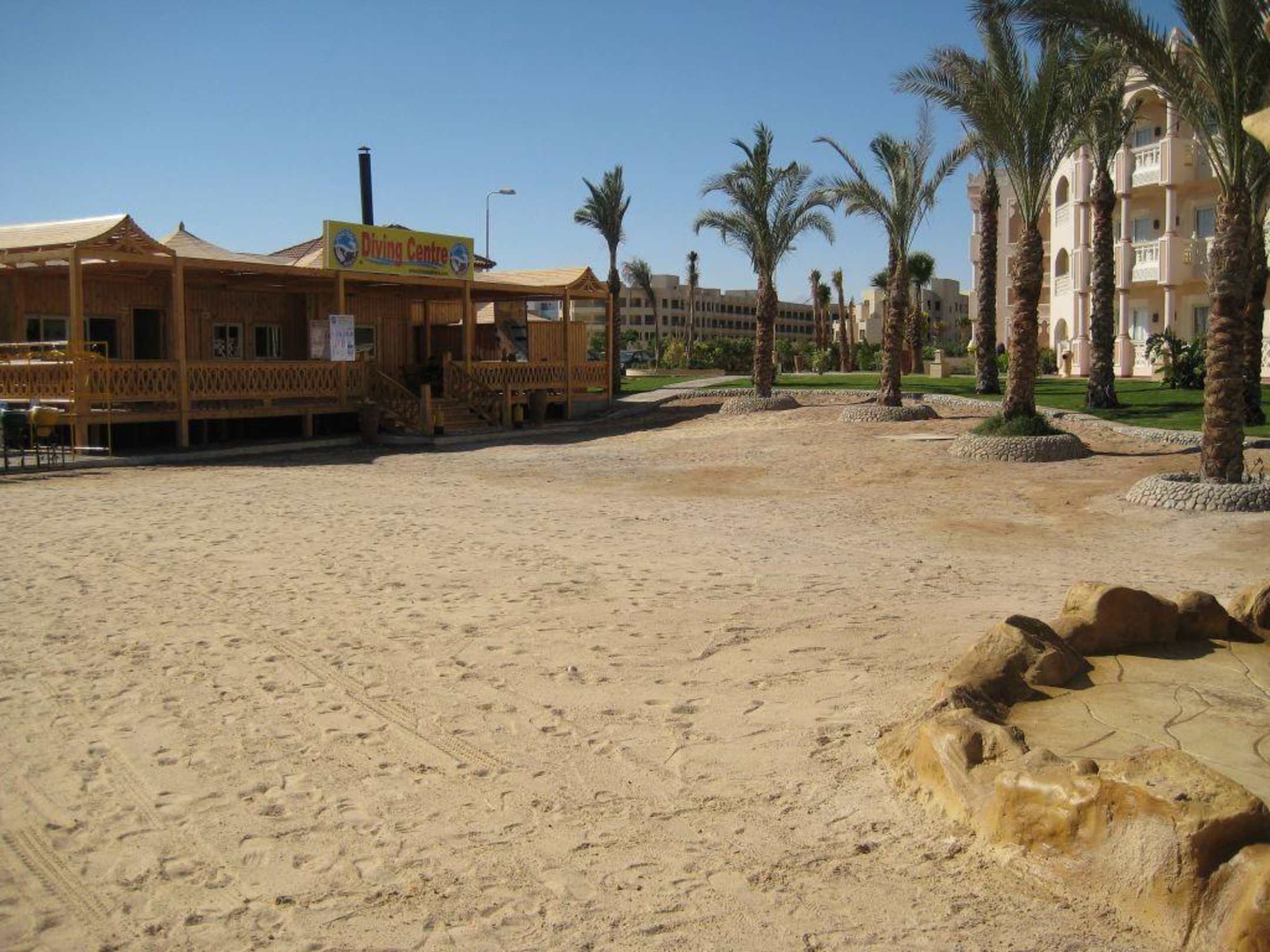 Ende des rechten Hotelflügels, mit Blick auf den Rohbau des Nachbargrundstückes - kein Baulärm zurzeit. Vorgelagert das Diving Center und davor die Surfbasis und gleichzeitiges Ende des Strandes vom Palace.