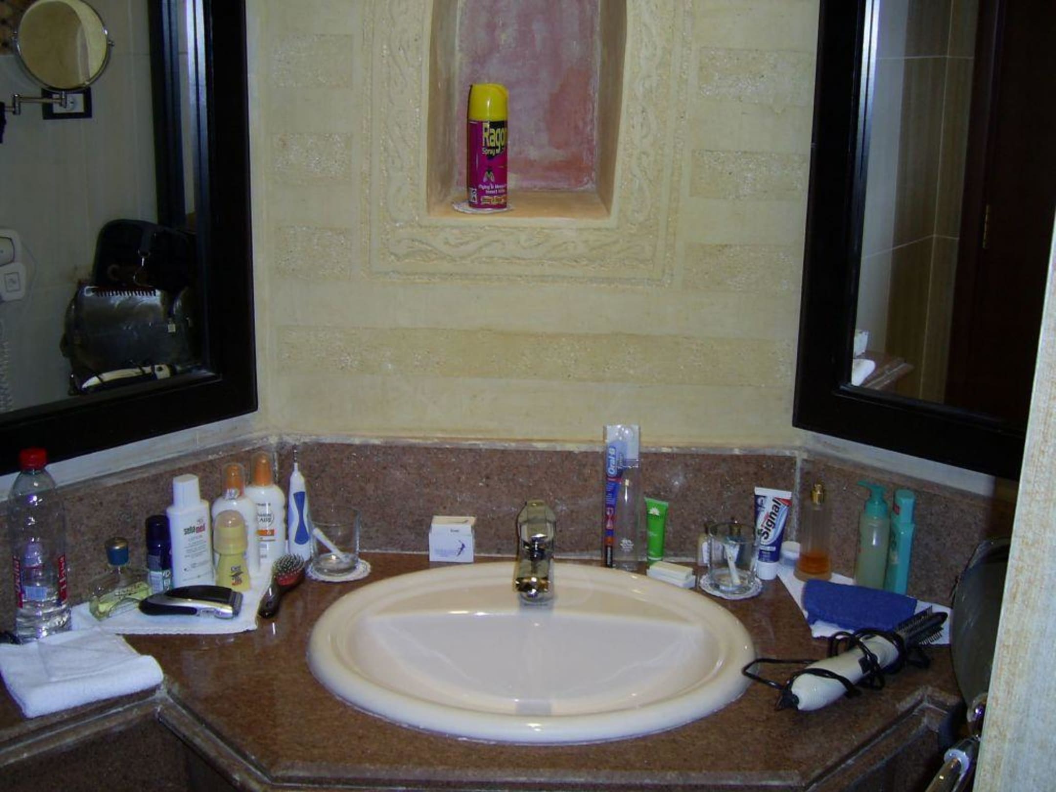 BadezimmerAblagemöglichkeiten ums Waschbecken herum waren ok. Ein Spiegel rechts, einer links - zum Rasieren wäre einer in der Mitte praktischer. Eine Wandnische gibts auch noch - das Insektenspray, das ihr dort seht, stinkt fürchterlich (haben es nur 1x benutzt bzw. gebraucht)