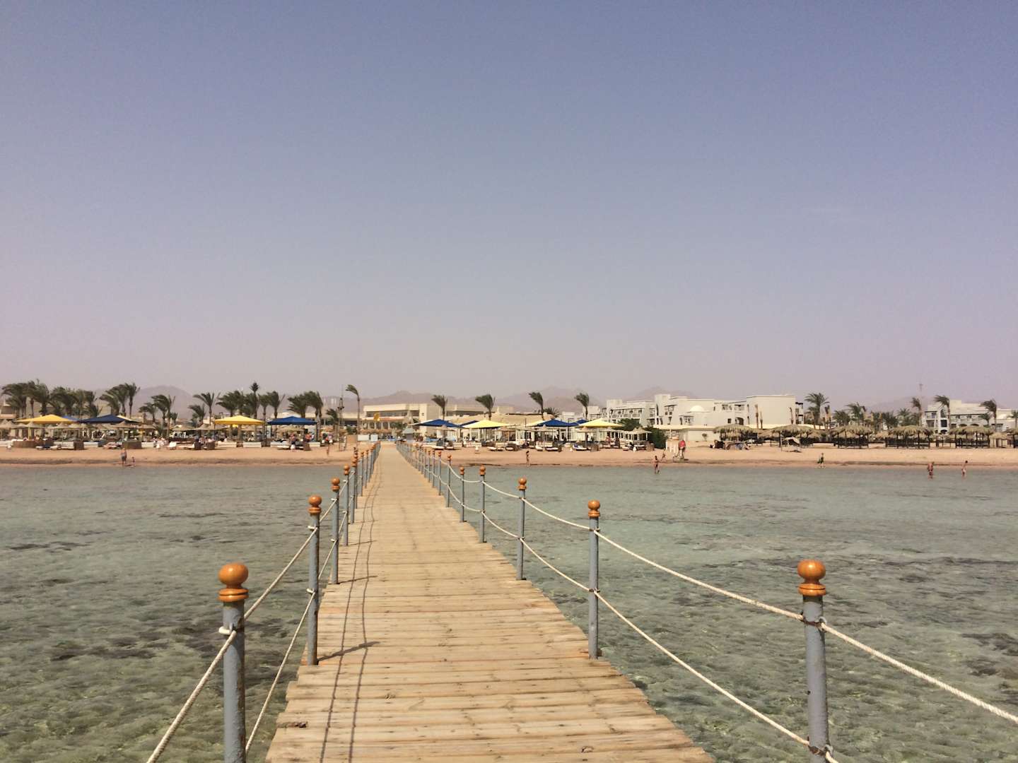 Blick auf den Strand/ das Hotel vom Steg aus