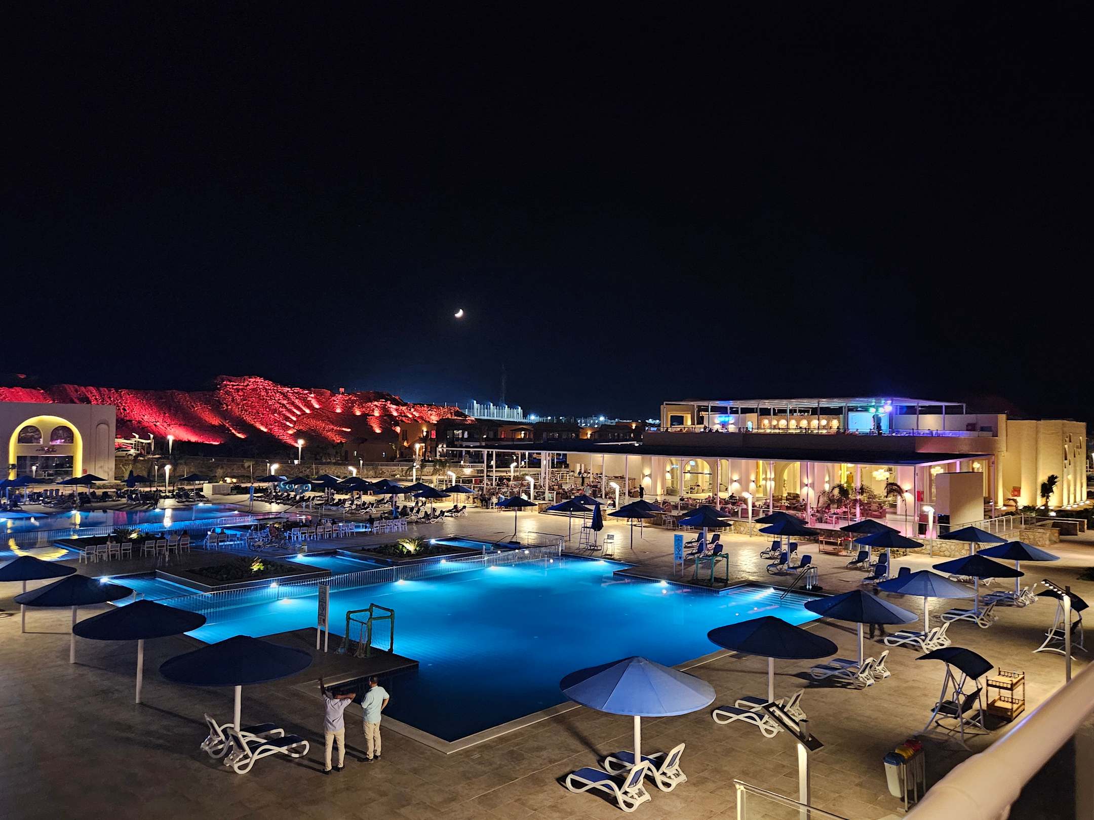 Hauptpool mit Lobby und Dachterrasse im Hintergrund.