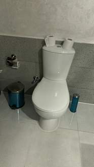 Bad: Klobürste und Abfalleimer noch original verpackt