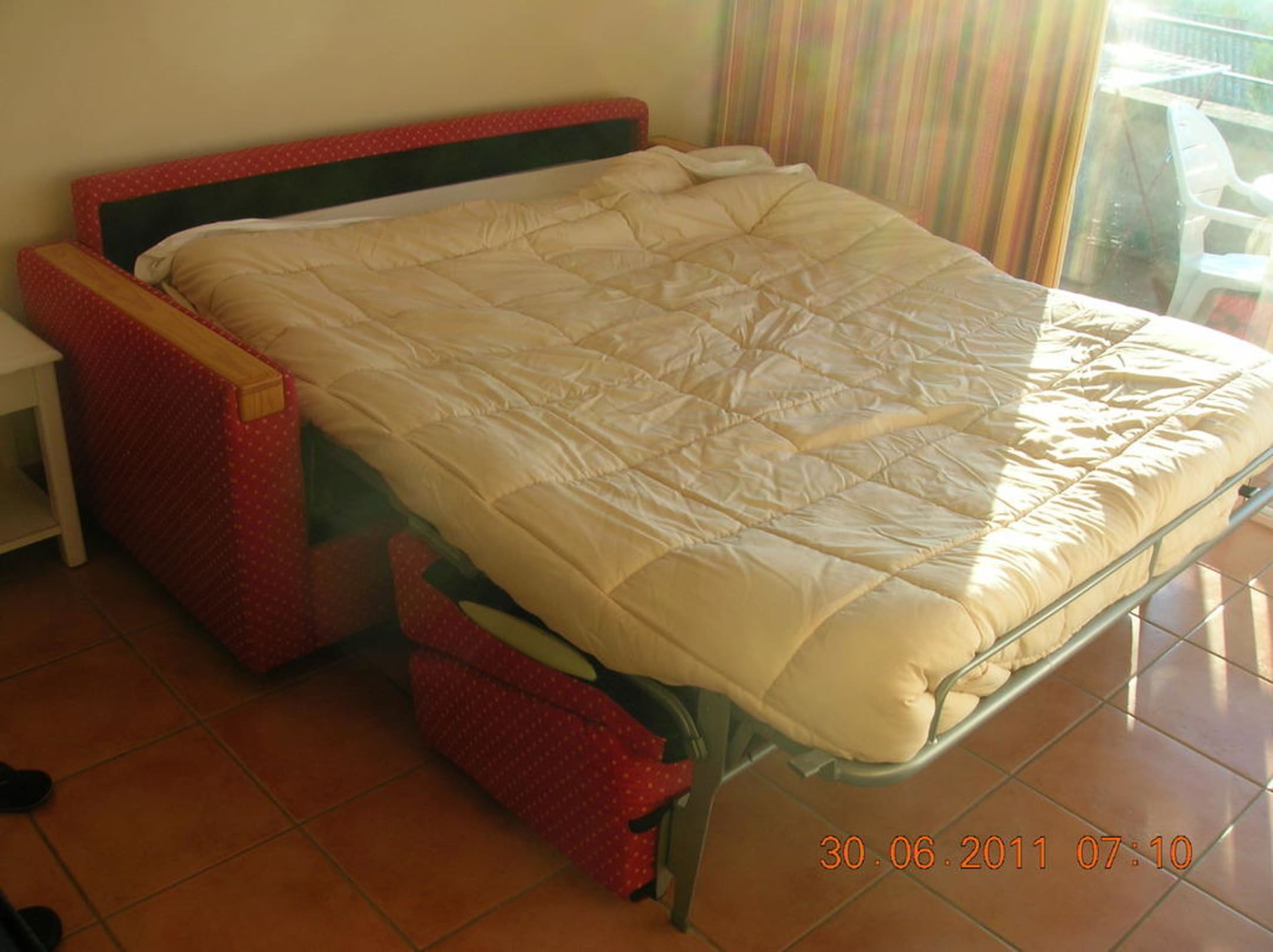 Ausziehcouch Wir hatten die Wahl, entweder auf dieser durchgelegenen Couch im Wohnzimmer oder im Kinderzimmer auf zwei kleinen Betten zu schlafen