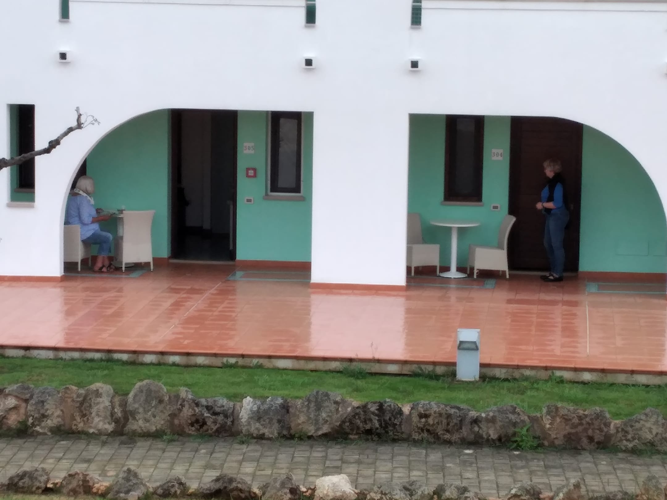 Eingangstür und Terrasse der Einzelzimmer