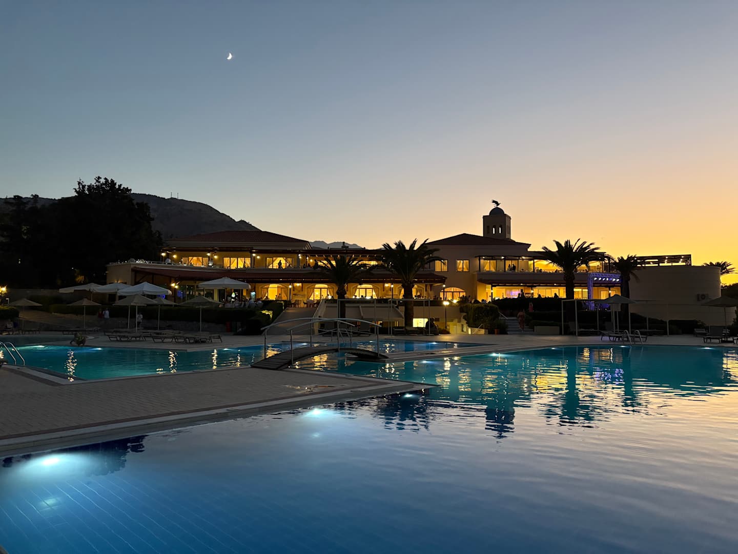 Blick über die Pools auf das Hauptgebäude jenseits der Straße mit beiden Restaurants im Haupthaus.