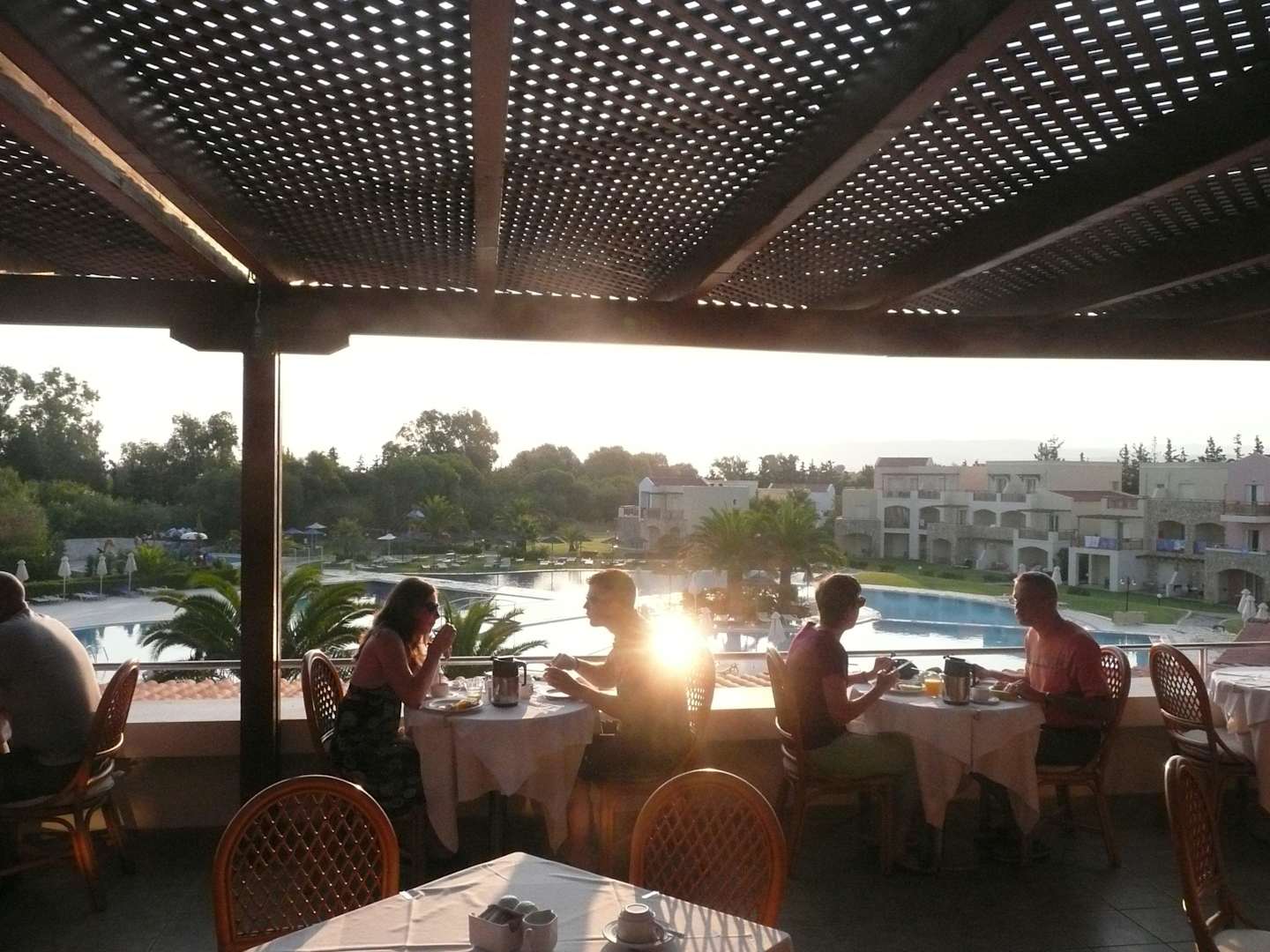 Restaurant mit Blick auf Pool und Wohnanlagen