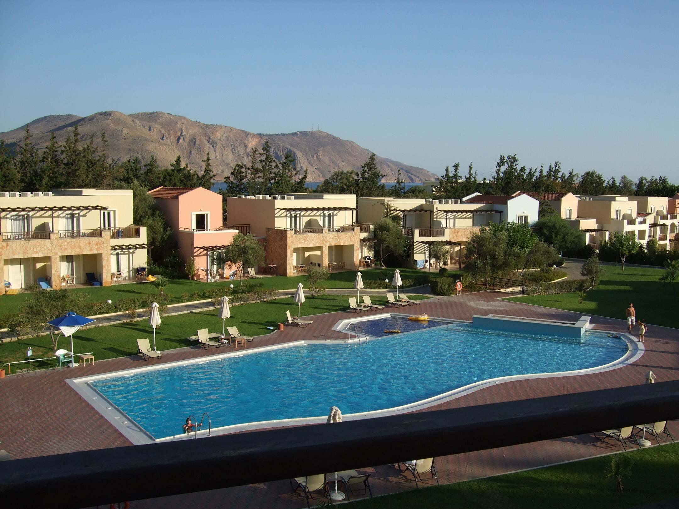 Blick von unserem Zimmer auf Pool und Meer