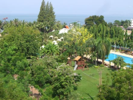 Blick vom Balkon in den Garten und auf's Meer.