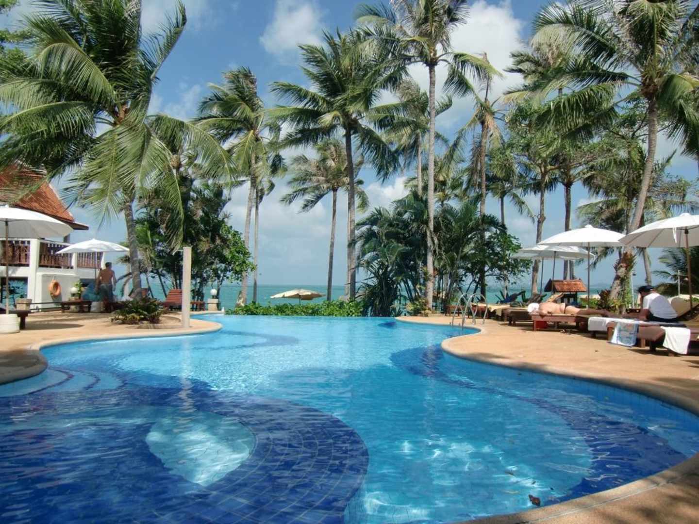 Herrlicher Blick, immer sauberes Wasserleider kann man vom Pool aus das Meer eher nicht sehen, wegen des Grünzeugs. Links das Massage(Spa)-Häuschen