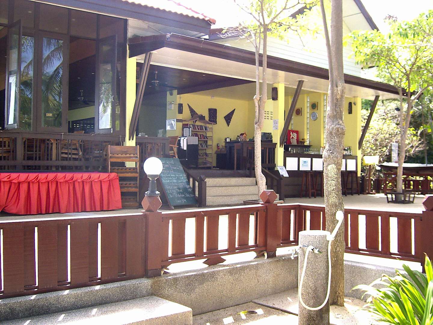 Blick vom Strand auf Restaurant, "Bücherei" und Bar