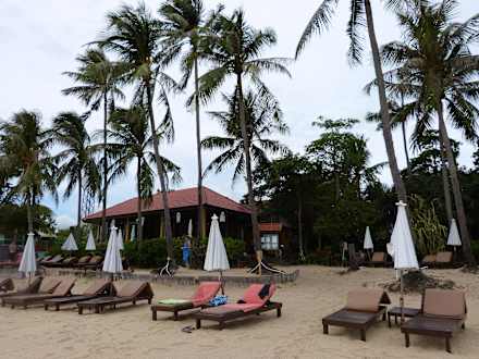 Strand mit Restaurant im Hintergrund