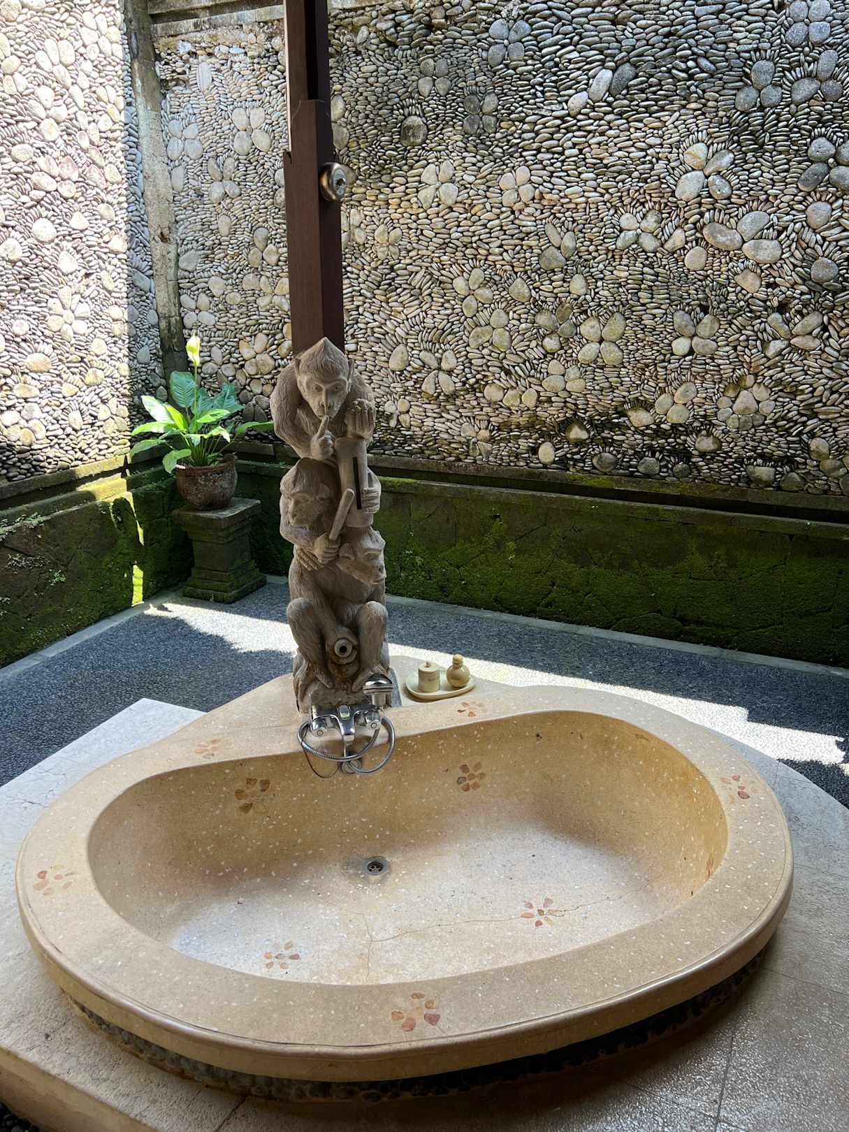Badewanne und Dusche befinden sich außerhalb, sind aber durch das Bad erreichbar und überdacht.