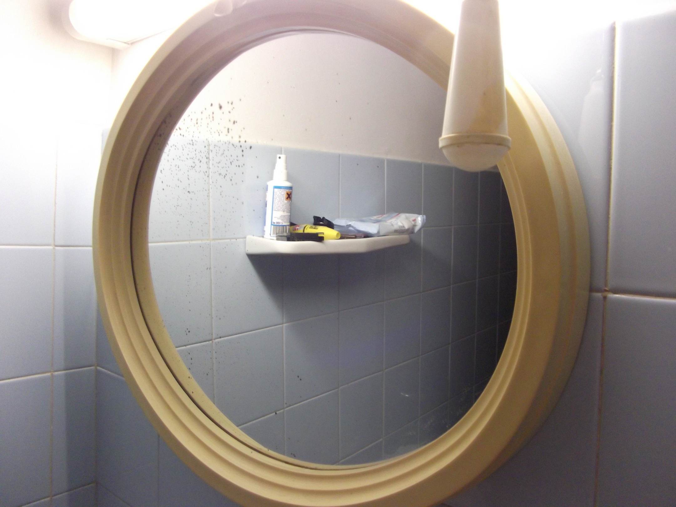 Gelber Griff von der Toilettenkette & Spiegel