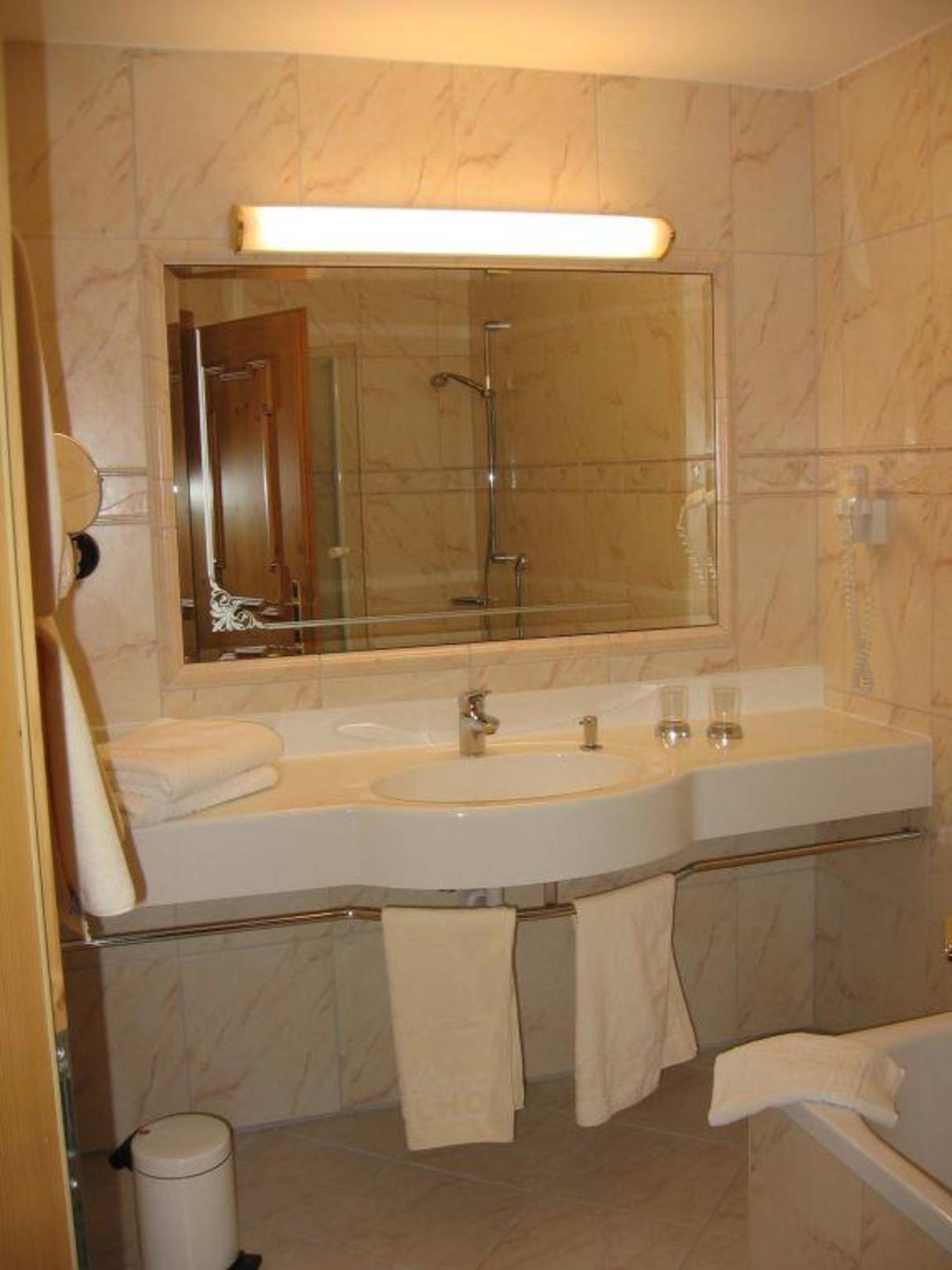Im Badezimmer befindet sich eine Badewanne mit großzügigem Duschteil, Glasduschwand, Handtuchheizung, Radio, Kosmetikspiegel. Die Toilette ist in einem seperaten Raum.