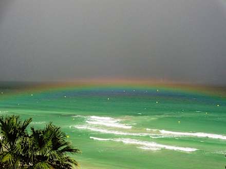 Gewitter mit Regenbogen über dem Meer