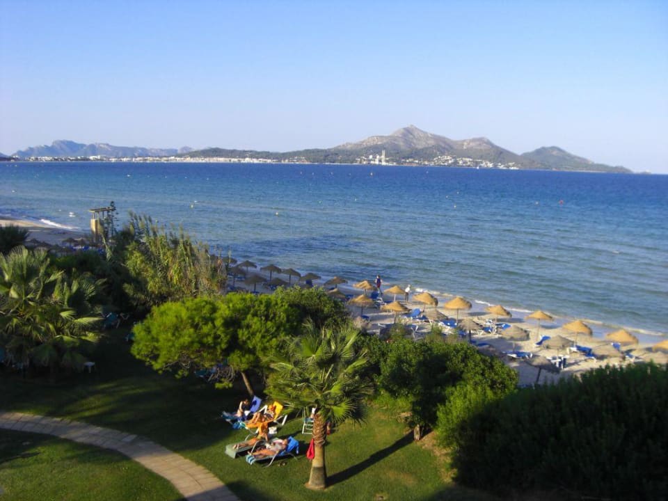 Hotelpark im Vordergrund, Strand, Meer