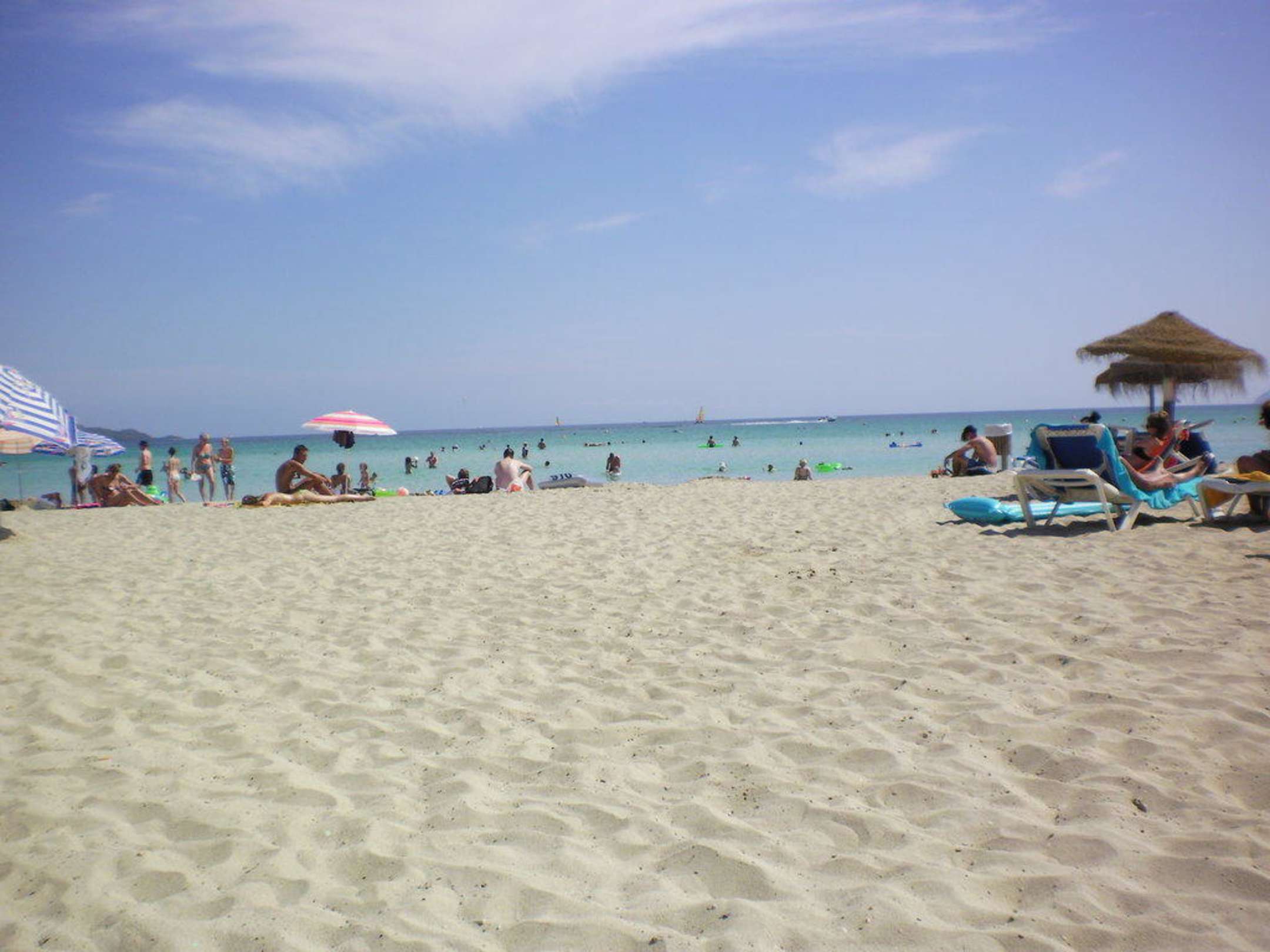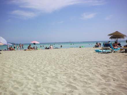 Strand (öffentlich)Gartenanlage im Rücken. Links Strand ohne Liegestühle, rechts mit (Liege 2,50 Euro). Daneben gibt es auch zwei Volleyballfelder. Ich war überrascht, trotz Hochsaison und ausgebuchtem Hotel nicht wie die Ölsardinen am Strand sein zu müssen.