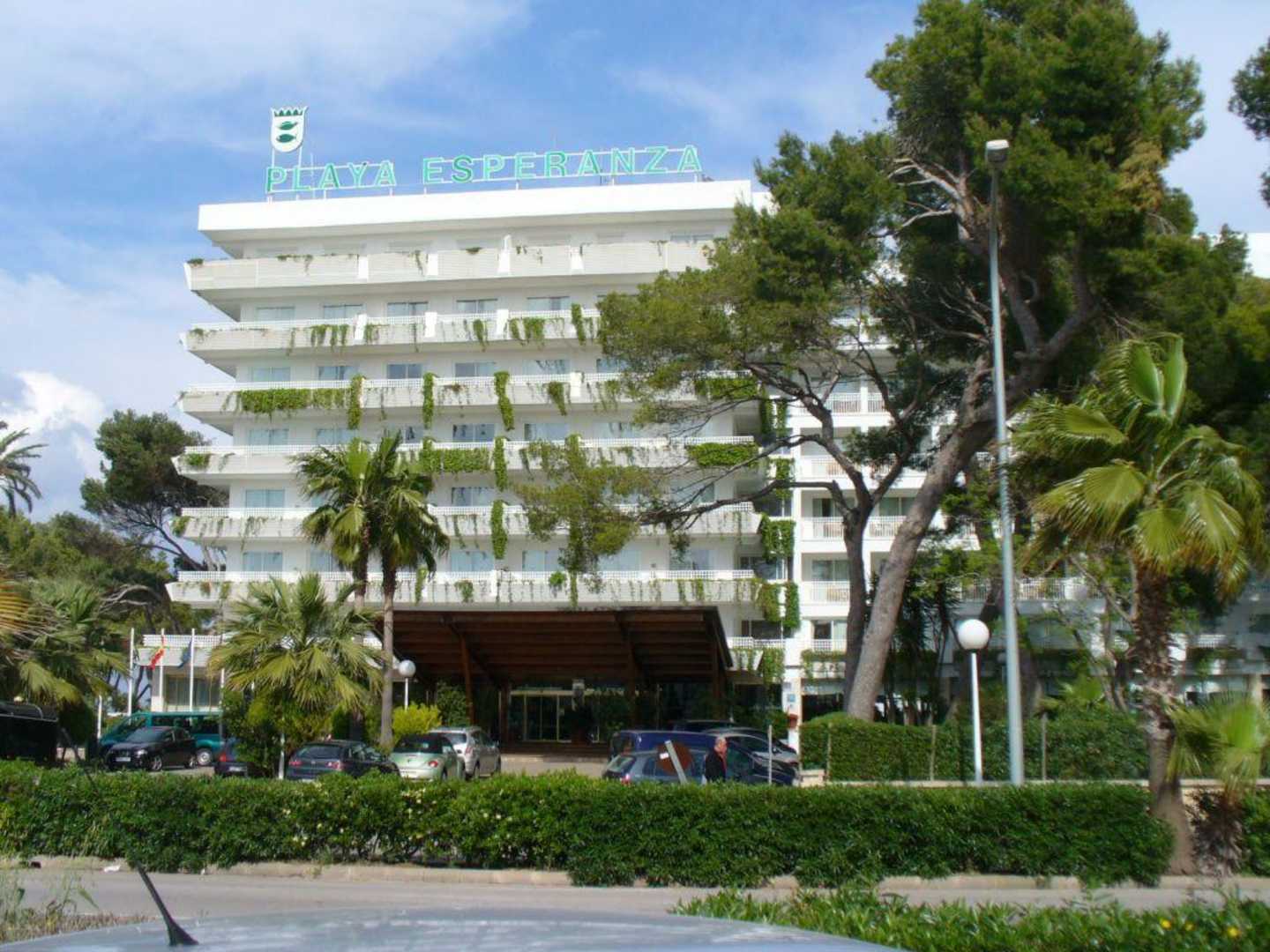 Hotel Playa Esperanza, Avenida S'Albufera 4, E-07458 Bucht von Alcudia. Aufnahme von der Straßenseite, dahinter liegt direkt die Hotelanlage und der Strand.