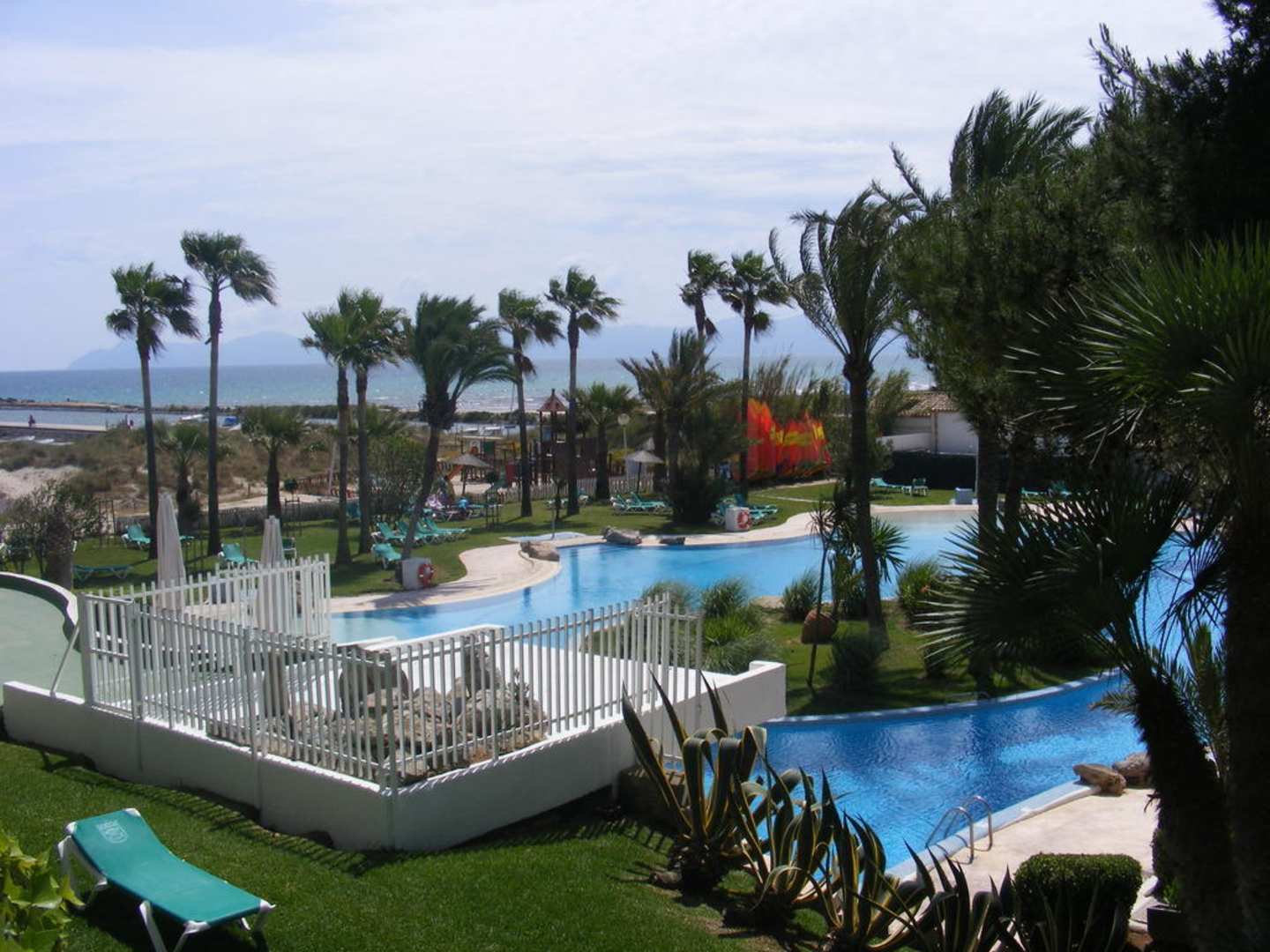 Blick vom Balkon auf Pool, Garten und Meer