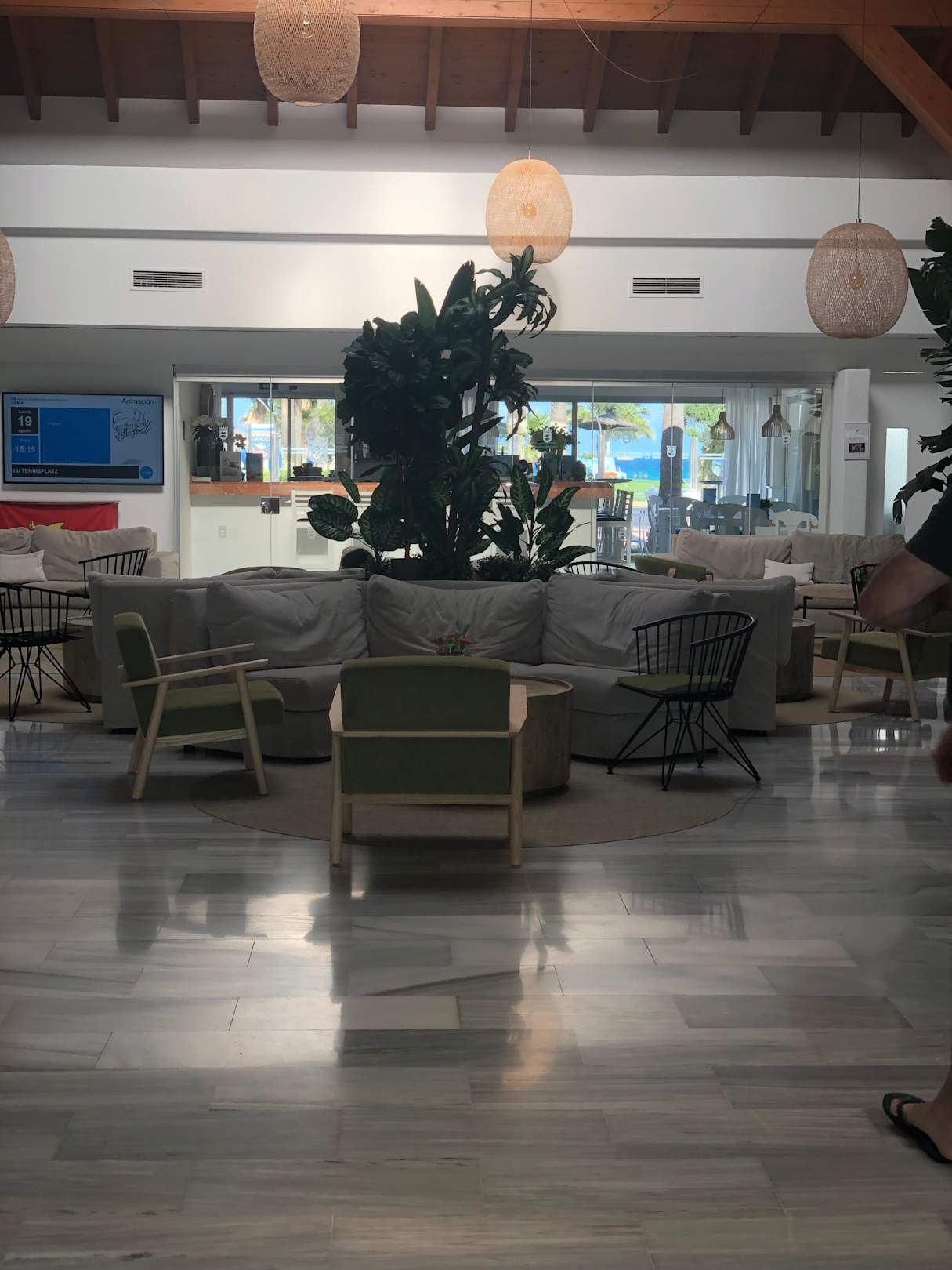 Schön renovierte Lobby mit vielen gemütlichen Sitzgelegenheiten, dahinter die Hotelbar mit Außenbereich