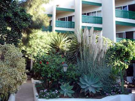 Hotel Playa Sur - Garten am EingangsbereichEl Médano, Hotel Playa Sur: Palmen- und Kakteengarten im Eingangsbereich des Hotels.