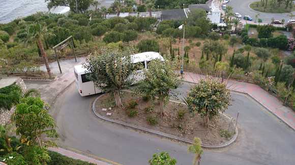 Reisebus beim Versuch, vor dem Hotel zu wenden