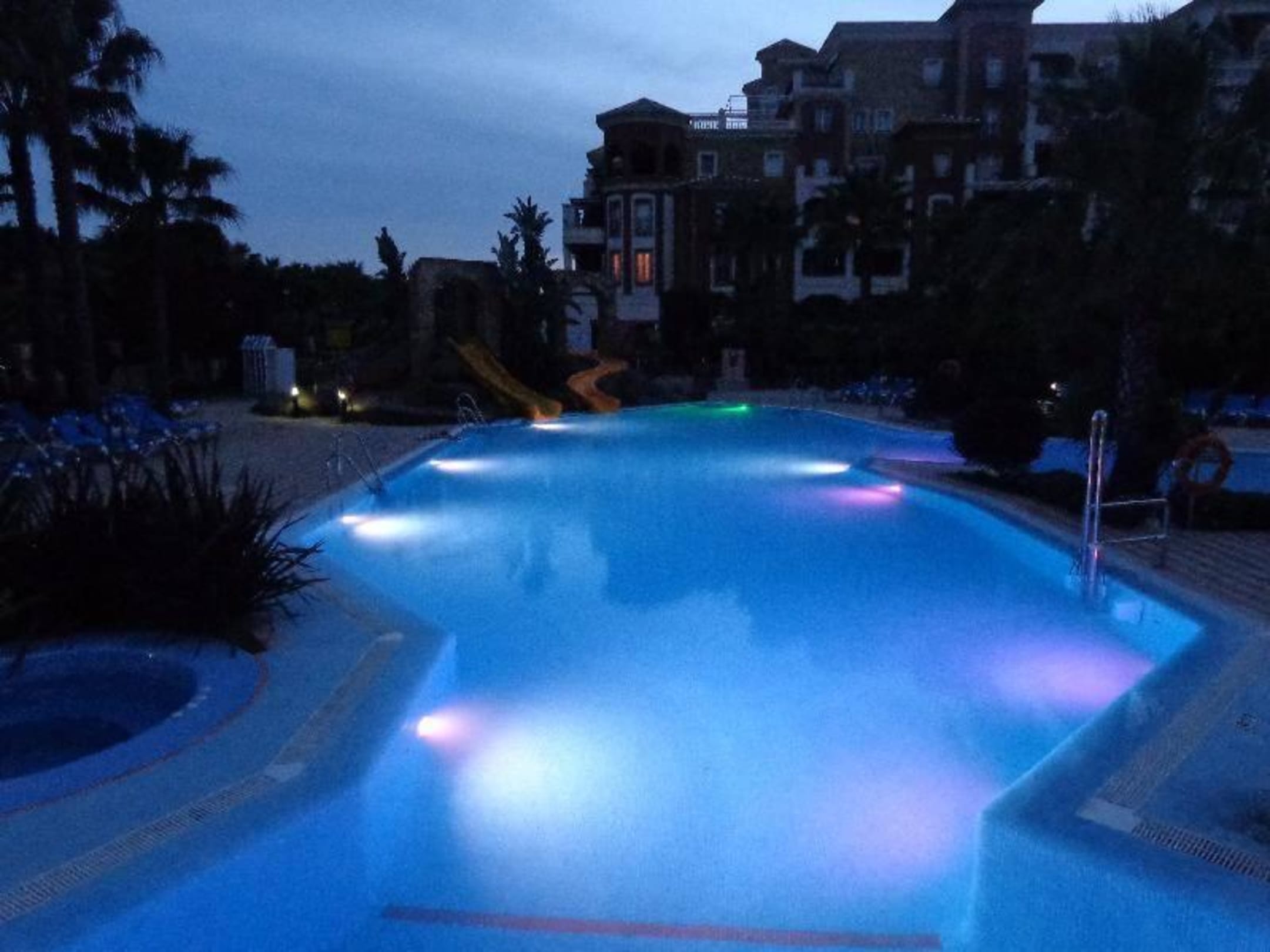Otra perspectiva nocturna de la piscina