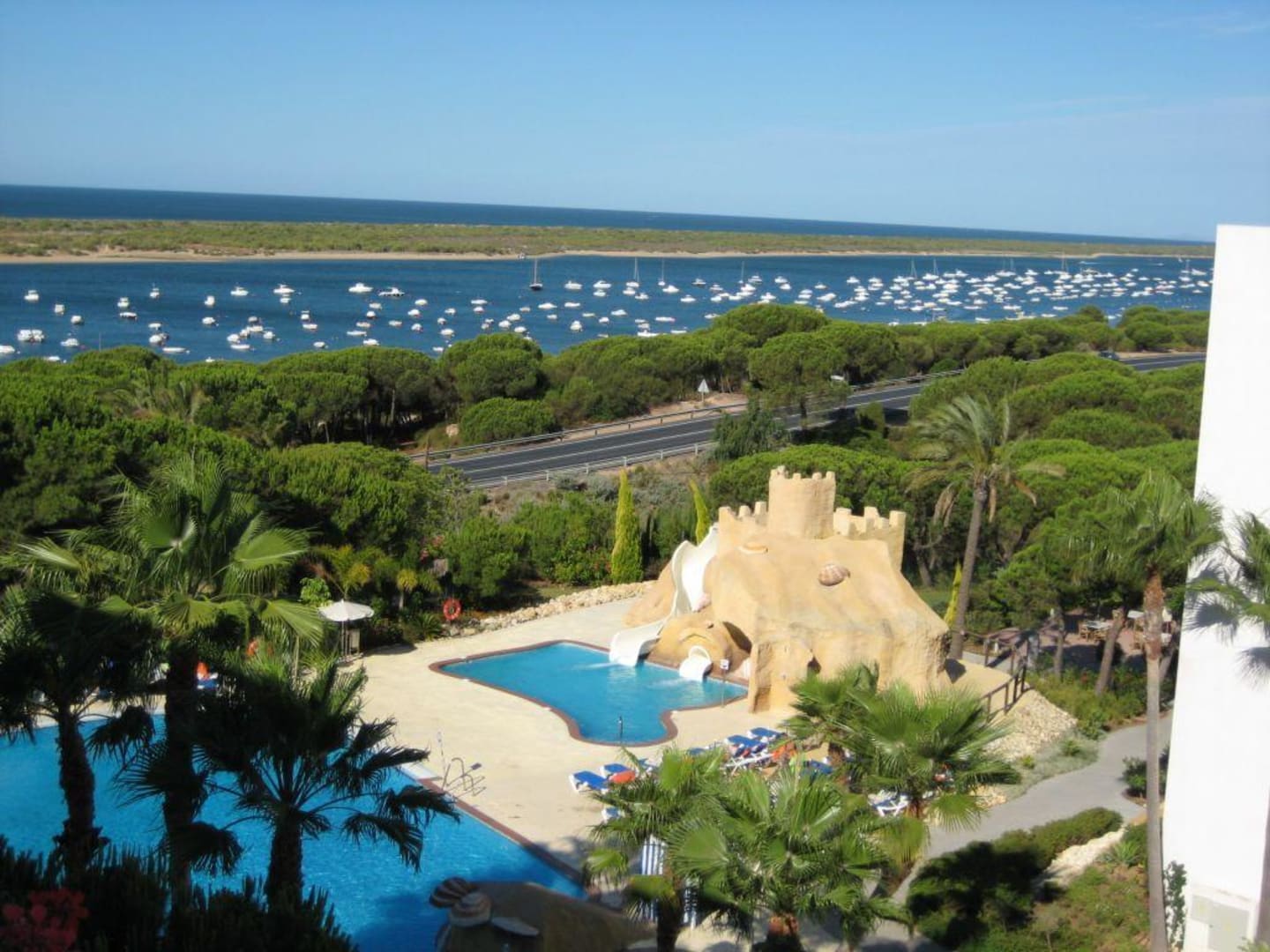 Blick auf einen Teil des Pools, dahinter die Flussmündung mit Booten. Zwischen Atlantik und Fluss sieht man eine Landzunge, die auch als Insel beszeichnet wird