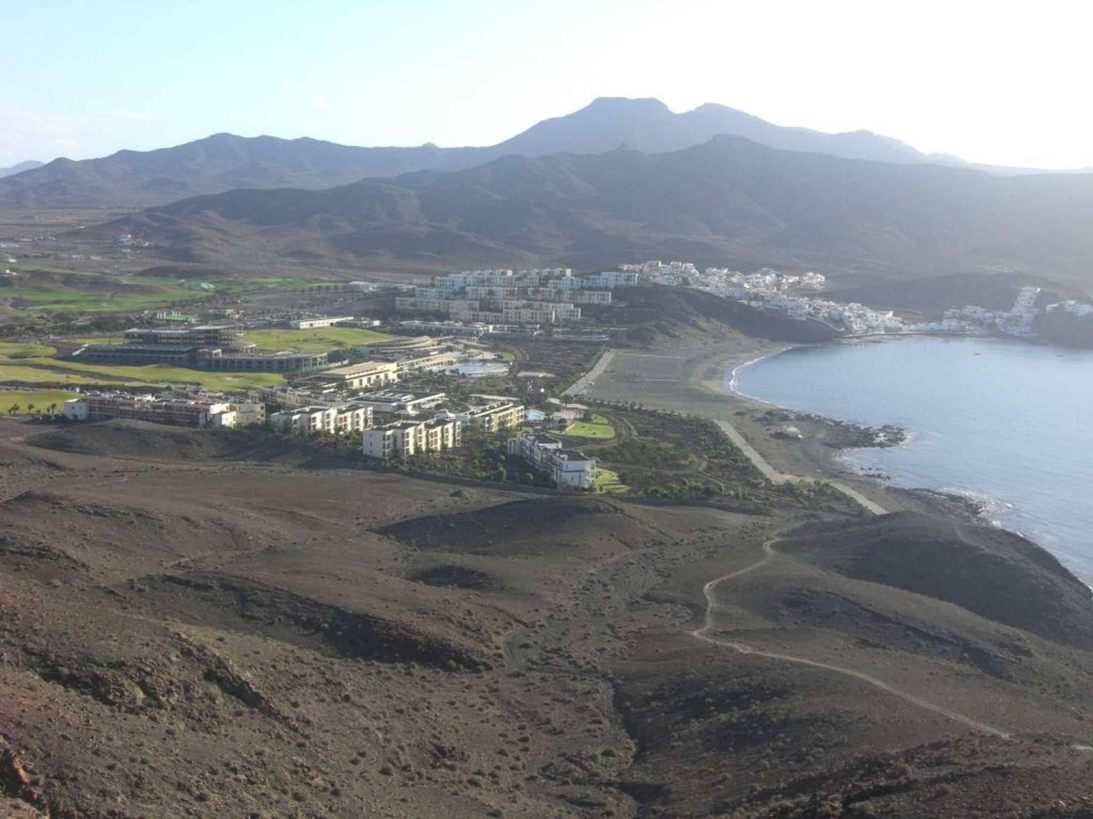 vorne das Bahia Grande, links davon die Villas. In der Mitte die Bauruine des Las Playitas Resort und hinten das Hotel Cala d'Or. Ganz hinten in der nächsten Bucht der Ort Las Playitas