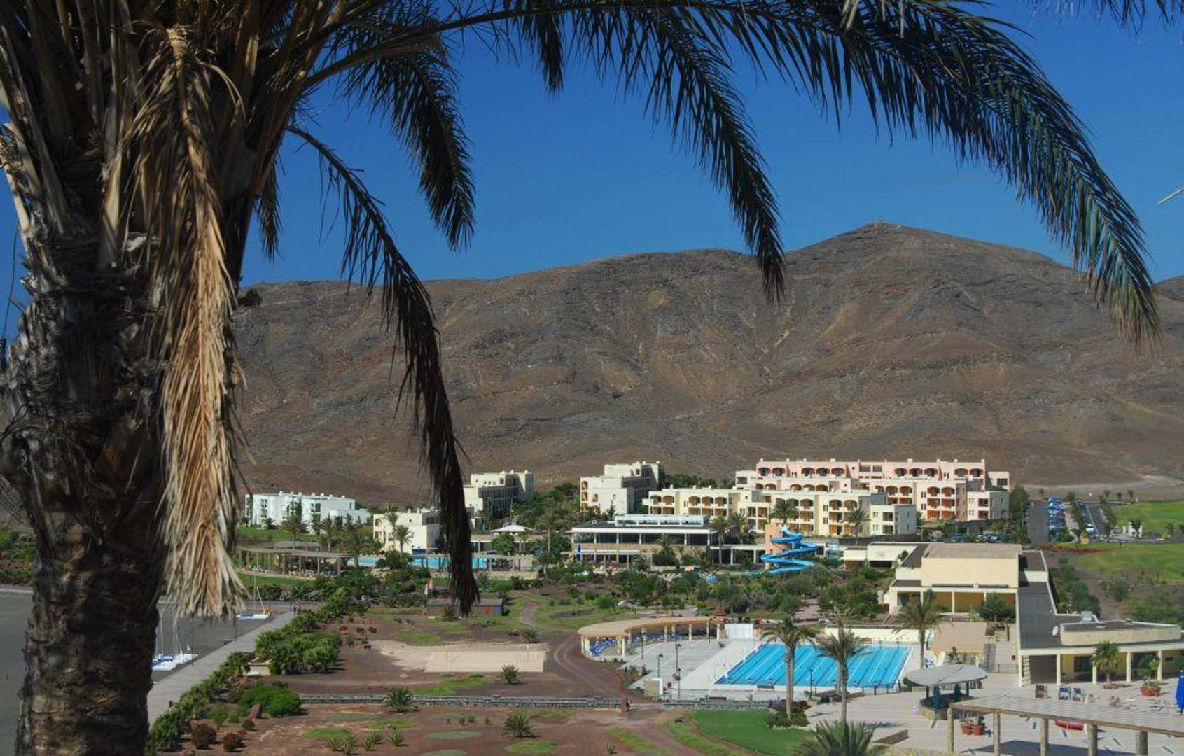 Blick vom Schwesterhotel Cala del Sol auf das Bahia Grande. Links der Strand. in der Mitte das Olympiabecken, dahinter die Wasserrutsche