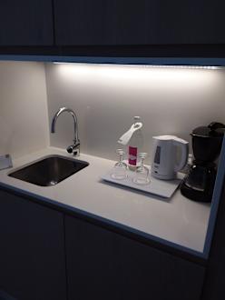 Küchenzeile, Kühlschrank ist rechts unten und die Mikorwelle links oben
