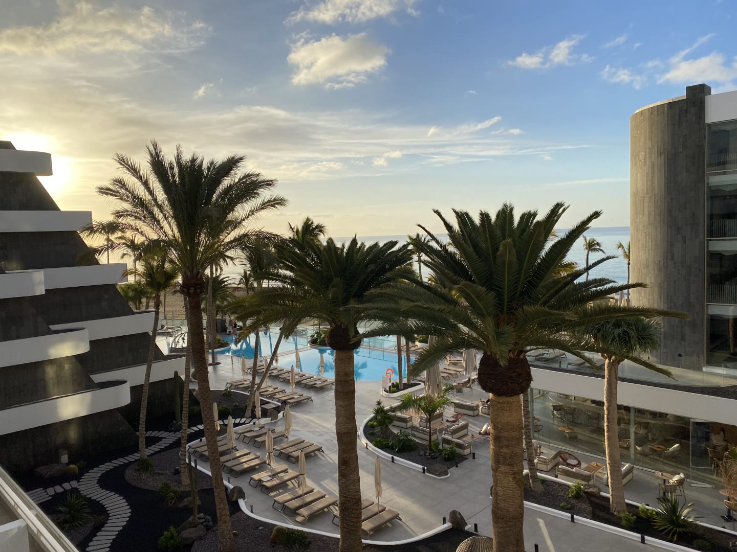Blick von unserem Balkon auf Außenanlagen und Pool