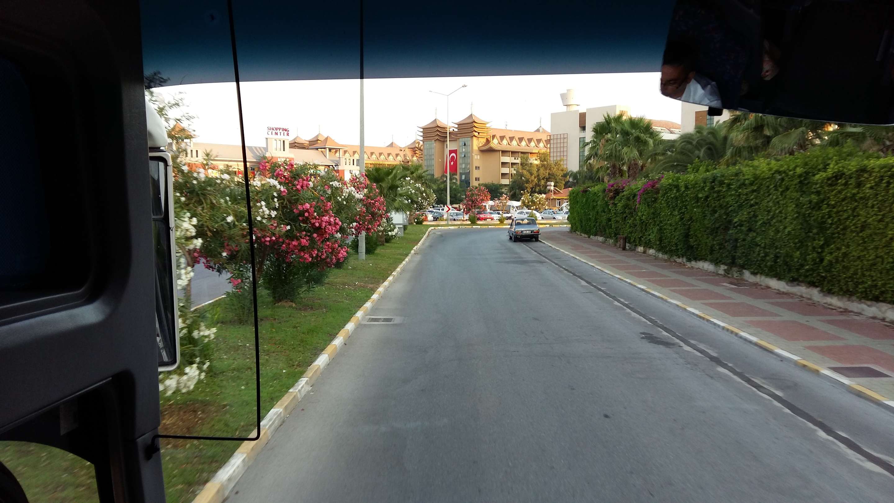 Auf der Fahrt im Bus, das Hotel rechts mit dem kleinen Tower auf dem Dach