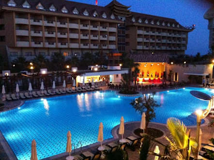 Poolanlage und Bühne bei Nacht