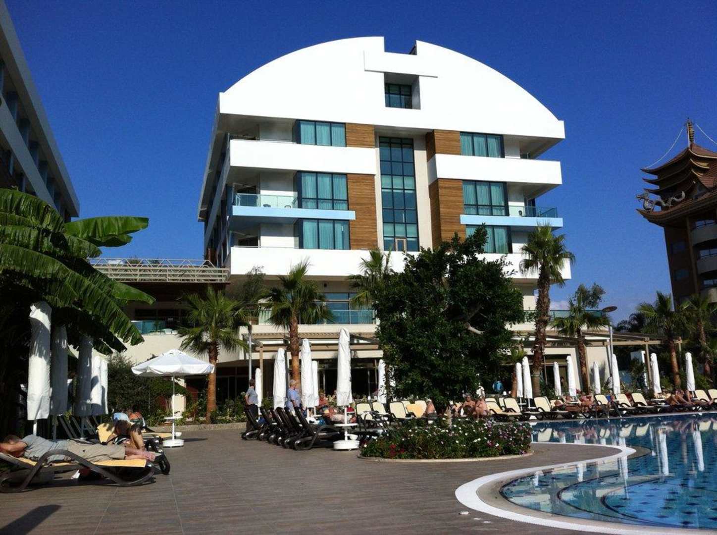 Am Pool mit Hauptgebäude
