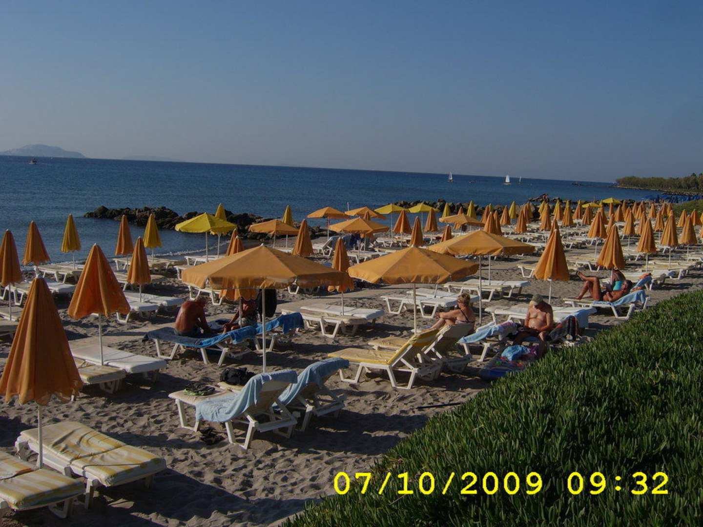 toller Sandstrand mit Liegen und Auflagen, auch der Sonnenschirm fehlt nicht. Aufgenommen am 7.10.2009 um 09:32 Uhr und die liegen sind nicht mit Tüchern bedeckt, ohne dass Gäste fehlen