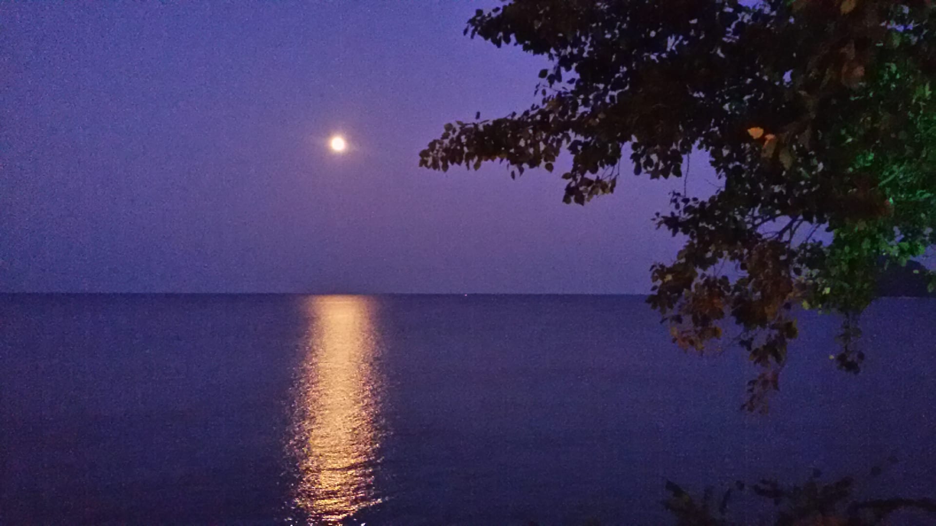 Vollmond über dem Meer aus Sicht von der Hotelterrasse beim Abendessen