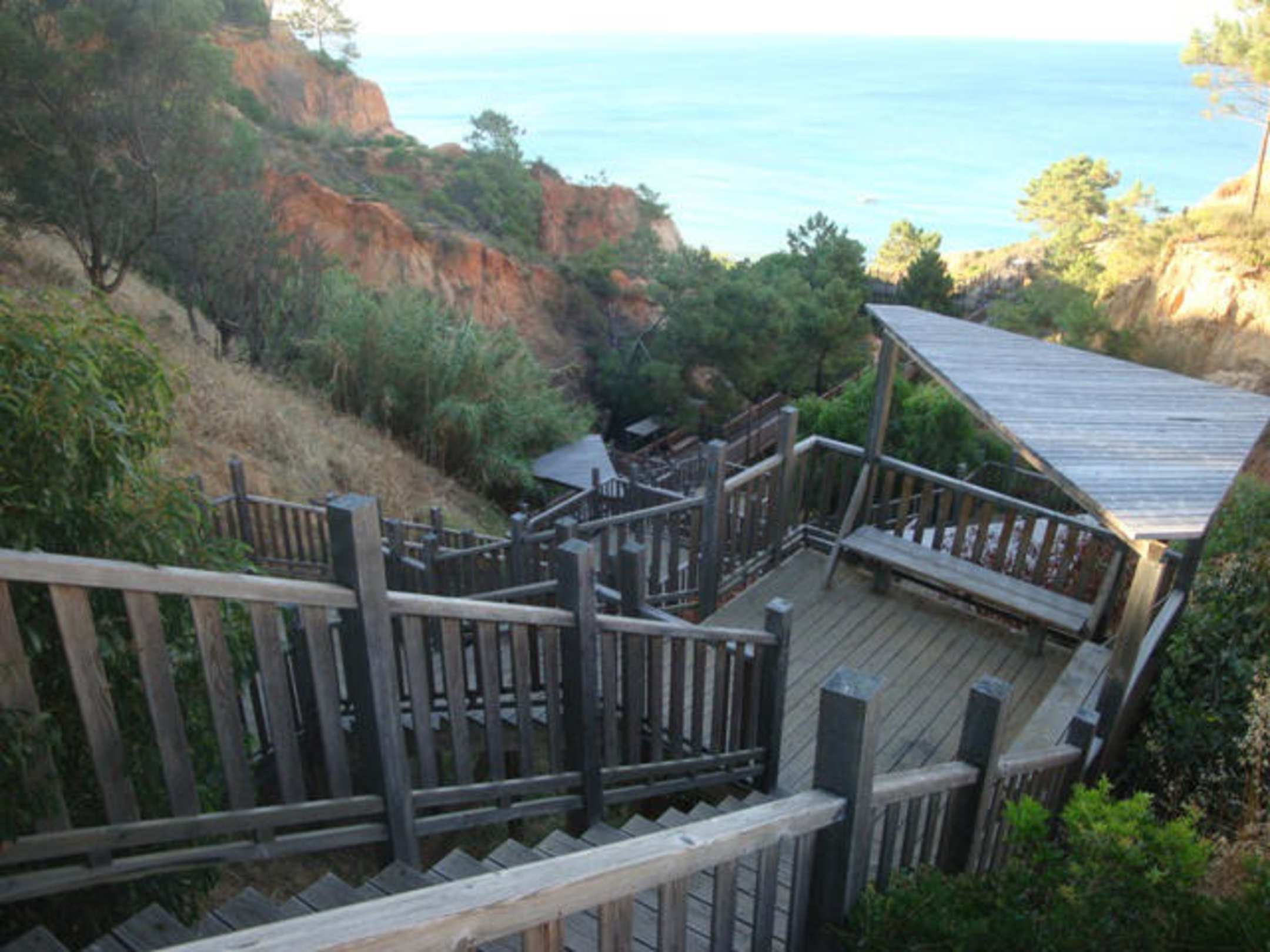 über schöne Holztreppen führt der Weg zur kleinen, idyllischen Hotelbucht (leider nur klein, ohne Sonnenschirme oder Liegestühle)