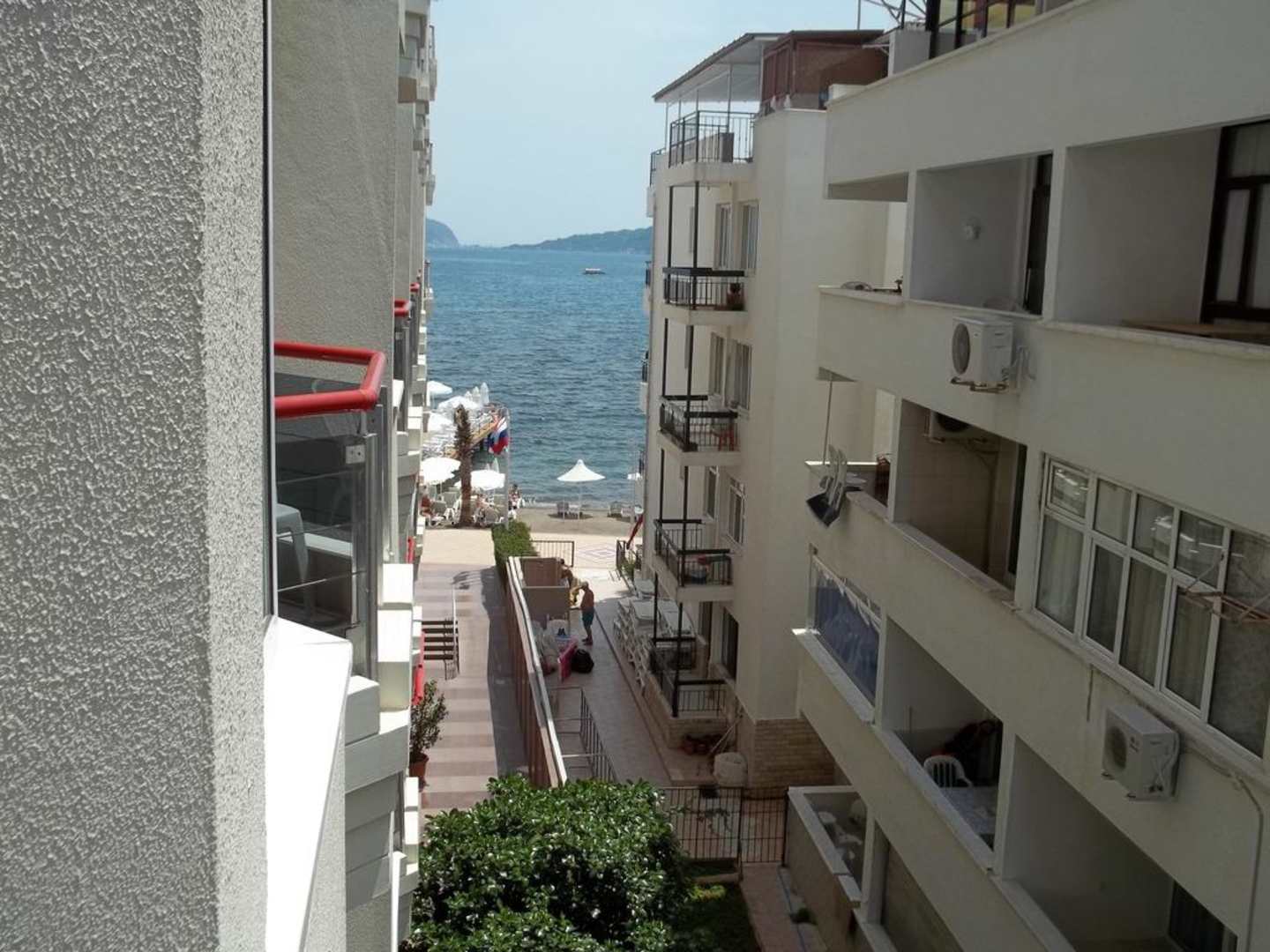 Blick durch die Hotelgasse aufs MeerDas war unser Blick aufs Meer, wir hatten aber auch keinen Blick aufs Meer gebucht.
