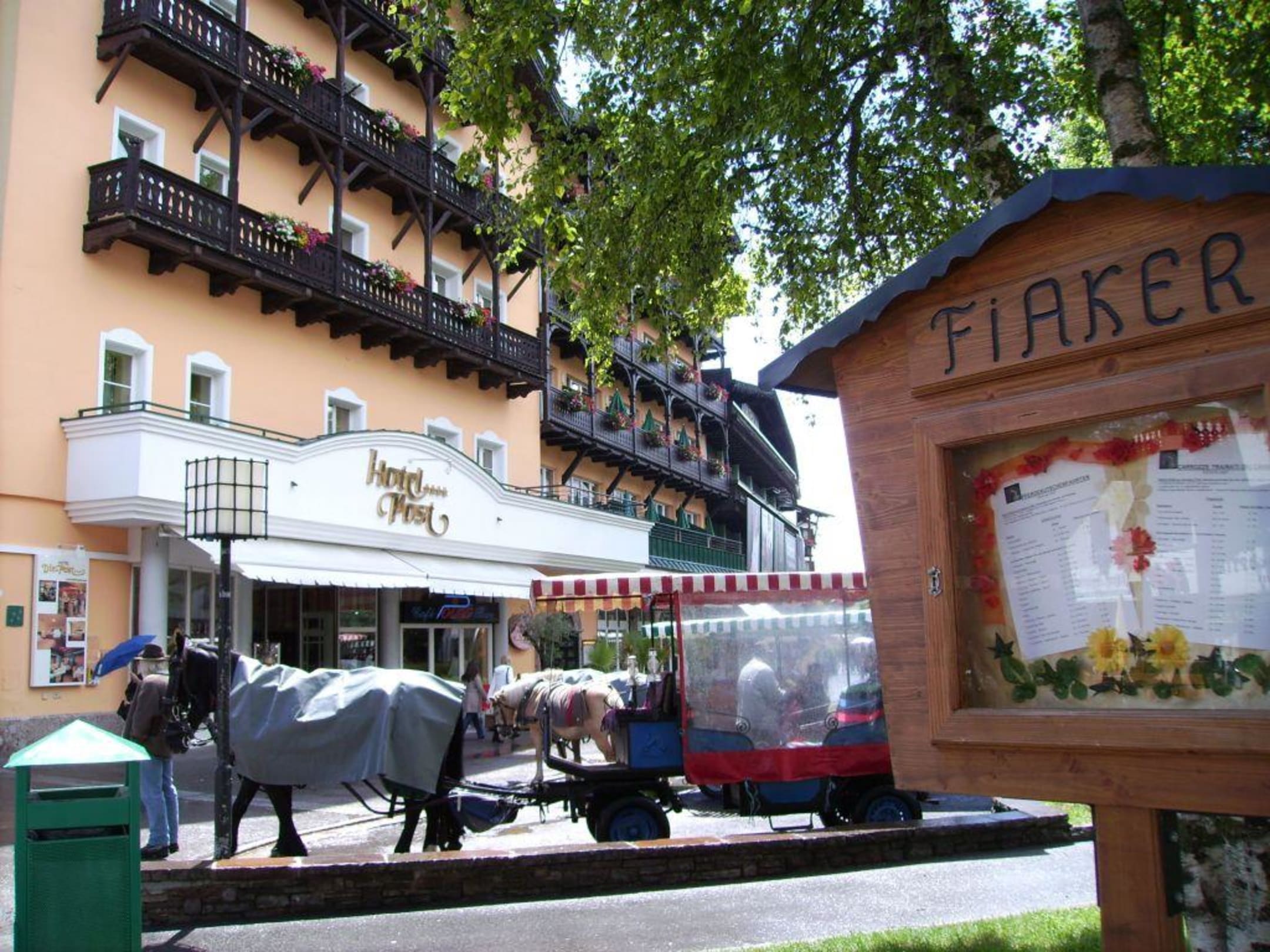Geduldig warten die Kutscher auf Kunden. Seefeld hat Flair wie Innsbruck oder Wien. Zeitweise stehen 6 Fiaker vor dem Hotel 'Die Post'.