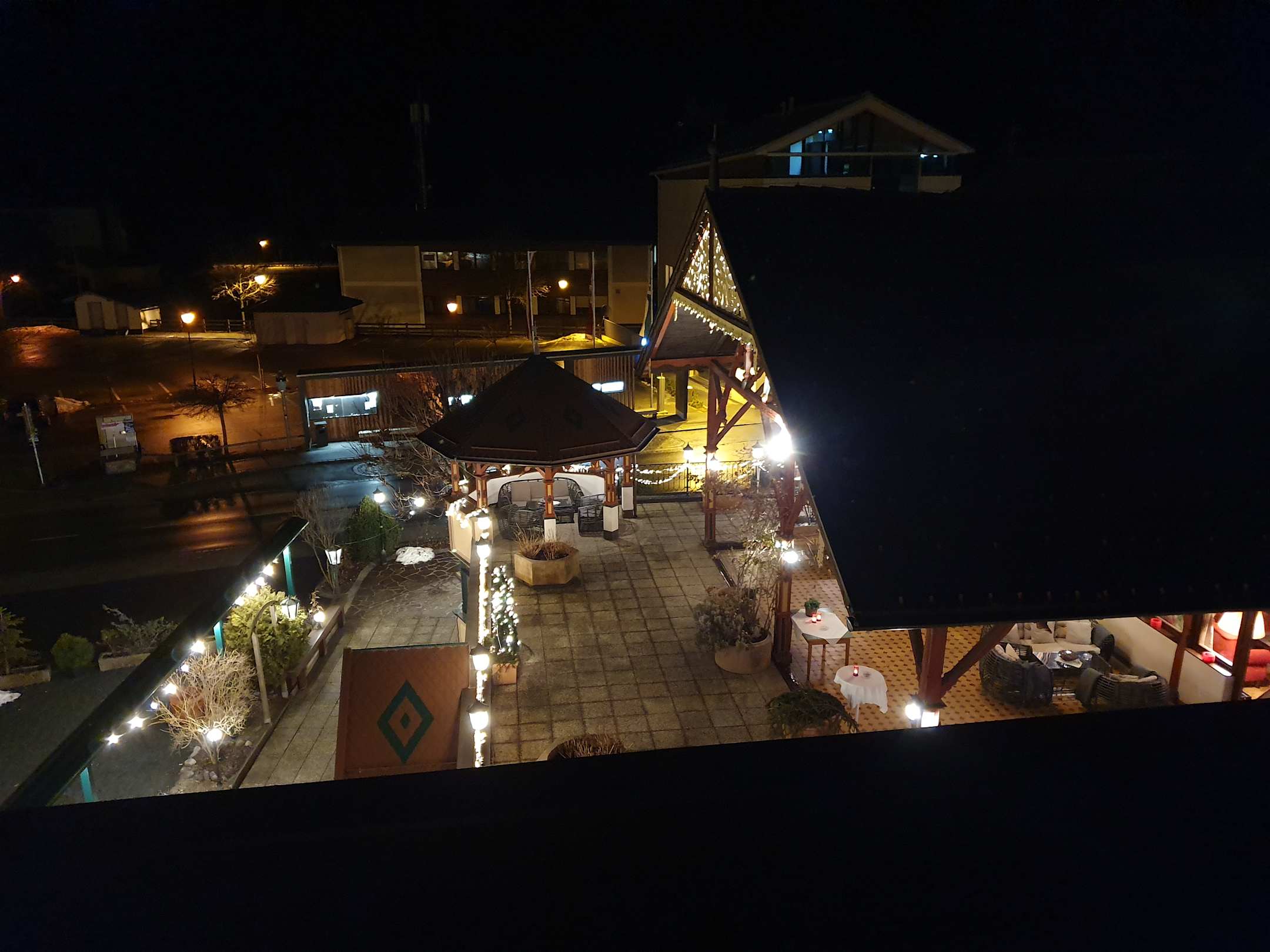 Ausblick vom Balkon bei Nacht auf die Terasse